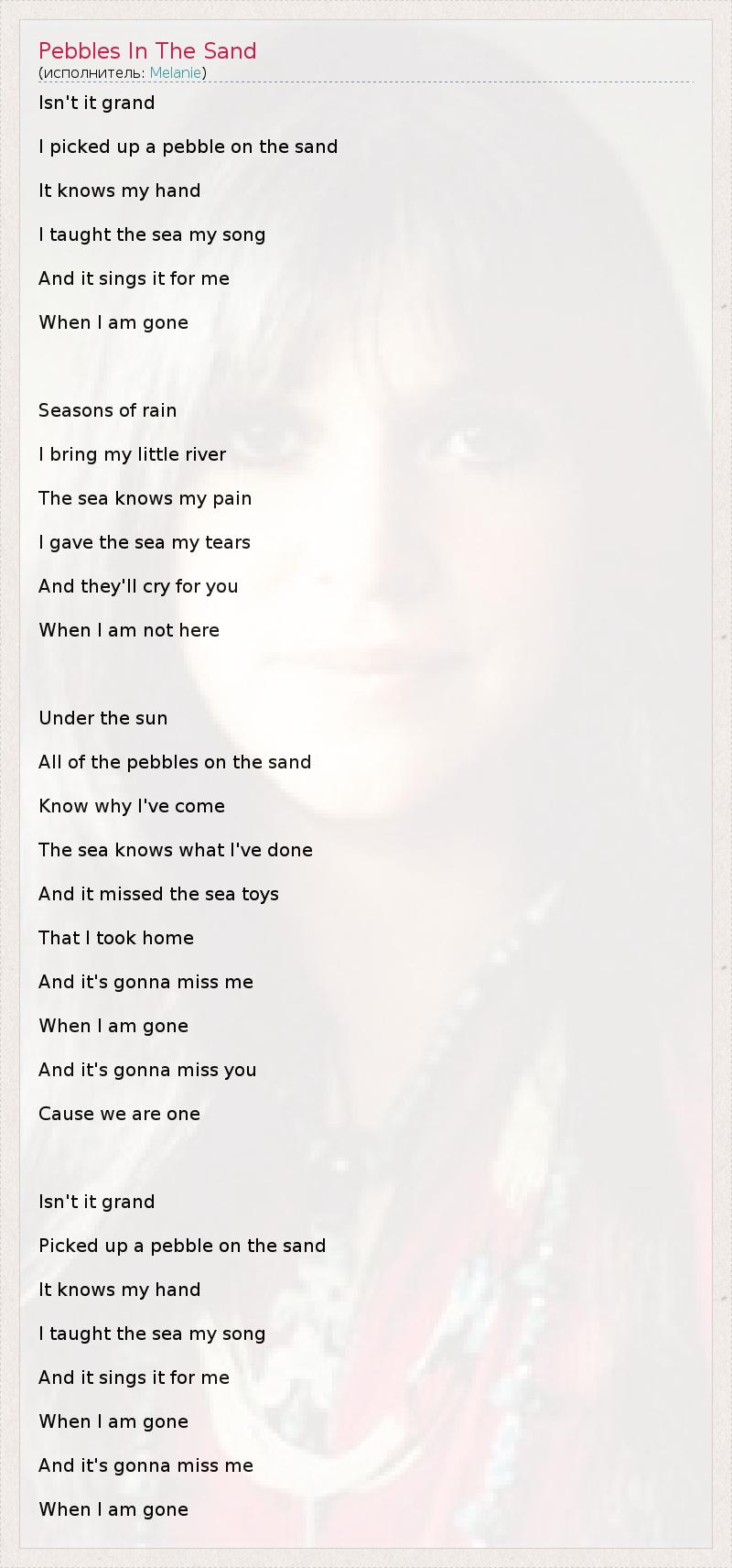 Isn't it grand I picked up a pebble on the sand It knows my hand I taught the sea my song And it sings it for me When I am gone Seasons of rain I bring my little river The sea knows my pain I gave the sea my tears And they'll cry for you When I am not here Under the sun All of the pebbles on the sand Know why I've come The sea knows what I've done And it missed the sea toys That I took home And it's gonna miss me When I am gone And it's gonna miss you Cause we are one Isn't it grand Picked up a pebble on the sand It knows my hand I taught the sea my song And it sings it for me When I am gone And it's gonna miss me When I am gone