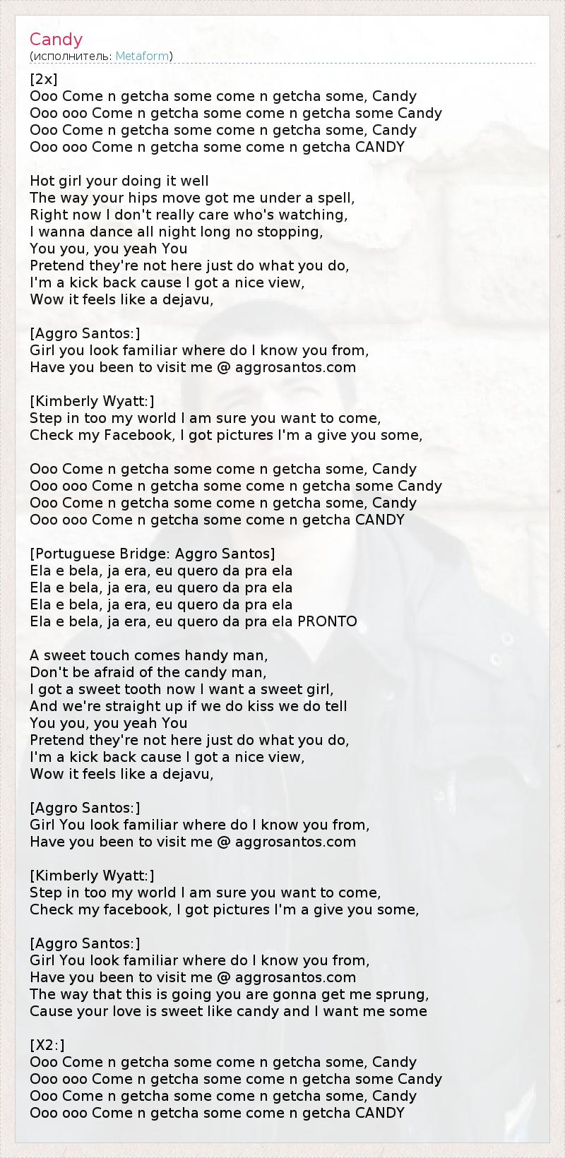[2x] Ooo Come n getcha some come n getcha some, Candy Ooo ooo Come n getcha some come n getcha some Candy Ooo Come n getcha some come n getcha some, Candy Ooo ooo Come n getcha some come n getcha CANDY Hot girl your doing it well The way your hips move got me under a spell, Right now I don't really care who's watching, I wanna dance all night long no stopping, You you, you yeah You Pretend they're not here just do what you do, I'm a kick back cause I got a nice view, Wow it feels like a dejavu, [Aggro Santos:] Girl you look familiar where do I know you from, Have you been to visit me @ aggrosantos.com [Kimberly Wyatt:] Step in too my world I am sure you want to come, Check my Facebook, I got pictures I'm a give you some, Ooo Come n getcha some come n getcha some, Candy Ooo ooo Come n getcha some come n getcha some Candy Ooo Come n getcha some come n getcha some, Candy Ooo ooo Come n getcha some come n getcha CANDY [Portuguese Bridge: Aggro Santos] Ela e bela, ja era, eu quero da pra ela Ela e bela, ja era, eu quero da pra ela Ela e bela, ja era, eu quero da pra ela Ela e bela, ja era, eu quero da pra ela PRONTO A sweet touch comes handy man, Don't be afraid of the candy man, I got a sweet tooth now I want a sweet girl, And we're straight up if we do kiss we do tell You you, you yeah You Pretend they're not here just do what you do, I'm a kick back cause I got a nice view, Wow it feels like a dejavu, [Aggro Santos:] Girl You look familiar where do I know you from, Have you been to visit me @ aggrosantos.com [Kimberly Wyatt:] Step in too my world I am sure you want to come, Check my facebook, I got pictures I'm a give you some, [Aggro Santos:] Girl You look familiar where do I know you from, Have you been to visit me @ aggrosantos.com The way that this is going you are gonna get me sprung, Cause your love is sweet like candy and I want me some [X2:] Ooo Come n getcha some come n getcha some, Candy Ooo ooo Come n getcha some come n getcha some Candy Ooo Come n getcha some come n getcha some, Candy Ooo ooo Come n getcha some come n getcha CANDY