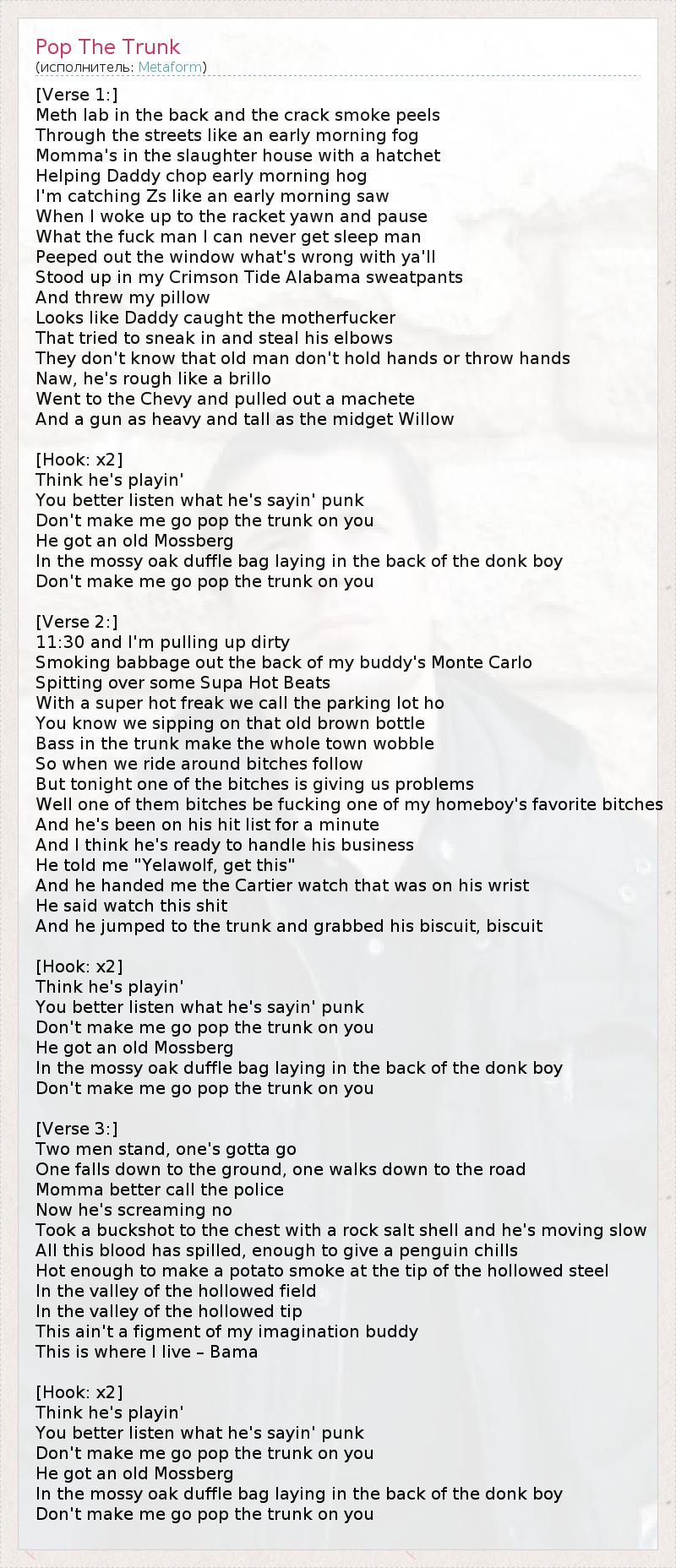 [1 куплет:] Мет-лаба на заднем дворе и дымок от выпаривания крэка, Стелющийся по улице, словно утренний туман... Моя маманя на бойне с топором в руках Помогает папане забить утреннего поросёнка. Я задаю храповицкого, как утренняя цепная пила, А потом просыпаюсь, чтобы громко зевнуть и сделать паузу. Что за ч*рт? Я никак не могу заснуть! Я высовываюсь из окна: что там такое? Я встаю в своих трениках с логотипом Crimson Tide Alabama 1 И отшвыриваю подушку. Похоже, папаня поймал того з**ранца, Который пытался пролезть и украсть его дозы. Им невдомёк, что старик не станет стоять, подняв руки вверх. Он суров, как губка для мытья посуды. Он подошёл к Шеви и достал оттуда мачете И ружьё – такое огромное и тяжёлое, как малыш Уиллоу. 2 [Хук: x2] Думаешь, он с тобой шутит? Лучше слушай, что он говорит, чмо! "Не вынуждай меня лезть в багажник!" 3 Старый Mossberg 4 Лежит у него за мотором в спортивной сумке цвета хаки, парень. "Не вынуждай меня лезть в багажник!" [2 куплет:] 11:30, и я отрываюсь, Смолю бэббидж 5 на заднем сидении Monte Carlo 6 своего кореша, Поплевываю в окно под Supa Hot Beats. 7 С одним безбашенным фриком мы вызвали на парковку ш**ху. Мы попиваем из старой коричневой бутылки, 8 Под бас из багажника весь город ходит ходуном, Поэтому когда мы едем кататься, тёлки с нами. Но этой ночью одна из этих с*чек доставила нам проблемы. Короче, какой-то с*кин сын драл одну из любимых тёлок моего кореша. Он тут же занёс его в свой чёрный список И, кажется, уже готов был управиться с делом, Как вдруг говорит мне: "Yelawolf, подержи-ка", – И протягивает мне часы Cartier со своего запястья. Говорит: "Посмотри за ними", – А сам бегом к багажнику и достаёт оттуда ствол, ствол! [Хук: x2] Думаешь, он с тобой шутит? Лучше слушай, что он говорит, чмо! "Не вынуждай меня лезть в багажник!" Старый Mossberg Лежит у него за мотором в спортивной сумке цвета хаки, парень. "Не вынуждай меня лезть в багажник!" [3 куплет:] Противостояние двух мужчин. Один должен уйти. Один падает на землю, другой продолжает свой путь. Малышка, лучше звони в полицию. Теперь он кричит: "Нет!" Он получает выстрел в грудь патронами с солью и медленно уходит. Его кровь настолько холодна, что от неё могут замёрзнуть пингвины, И настолько горяча, что может запечь картошку, насаженную на дуло. Это было в долине пустынных полей, Это было в долине охотничьих пуль... 9 Это не плод моего воображения, приятель. Это было там, где я живу, – в Баме. 10 [Хук: x2] Думаешь, он с тобой шутит? Лучше слушай, что он говорит, чмо! "Не вынуждай меня лезть в багажник!" Старый Mossberg Лежит у него за мотором в спортивной сумке цвета хаки, парень. "Не вынуждай меня лезть в багажник!" 1 – Crimson Tide – футбольная команда Алабамского университета. 2 – Уиллоу Афгуд – карлик-волшебник, герой американского кинофильма "Уиллоу". 3 – Выражение pop the trunk (дословно: "открыть багажник") в южных штатах Америки подразумевает угрозу (так как в багажнике может лежать бейсбольная бита, ружьё или другое оружие) и употребляется в конструкциях, родственных по смыслу фразеологизму "лезть на рожон". 4 – Mossberg 500 – одно из самых распространённых многозарядных ружей американской компании O.F. Mossberg & Sons. 5 – Babbage – курительная смесь низкого качества. 6 – Chevrolet Monte Carlo – американское двухдверное купе, выпускающееся с 1970 года. 7 – Supa Hot Beats (Уилл Пауэр) – американский музыкальный продюсер. 8 – Возможно, имеется в виду виски Jack Daniel's. 9 – В оригинале: hollow-point bullets (