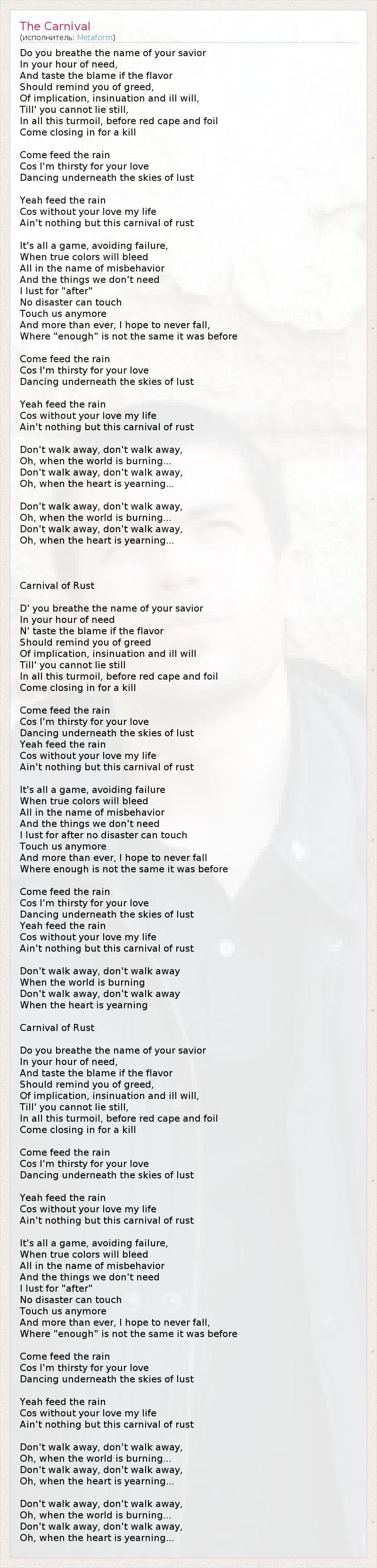 Do you breathe the name of your savior In your hour of need, And taste the blame if the flavor Should remind you of greed, Of implication, insinuation and ill will, Till' you cannot lie still, In all this turmoil, before red cape and foil Come closing in for a kill Come feed the rain Cos I'm thirsty for your love Dancing underneath the skies of lust Yeah feed the rain Cos without your love my life Ain't nothing but this carnival of rust It's all a game, avoiding failure, When true colors will bleed All in the name of misbehavior And the things we don't need I lust for "after" No disaster can touch Touch us anymore And more than ever, I hope to never fall, Where "enough" is not the same it was before Come feed the rain Cos I'm thirsty for your love Dancing underneath the skies of lust Yeah feed the rain Cos without your love my life Ain't nothing but this carnival of rust Don't walk away, don't walk away, Oh, when the world is burning... Don't walk away, don't walk away, Oh, when the heart is yearning... Don't walk away, don't walk away, Oh, when the world is burning... Don't walk away, don't walk away, Oh, when the heart is yearning... Carnival of Rust D' you breathe the name of your savior In your hour of need N' taste the blame if the flavor Should remind you of greed Of implication, insinuation and ill will Till' you cannot lie still In all this turmoil, before red cape and foil Come closing in for a kill Come feed the rain Cos I'm thirsty for your love Dancing underneath the skies of lust Yeah feed the rain Cos without your love my life Ain't nothing but this carnival of rust It's all a game, avoiding failure When true colors will bleed All in the name of misbehavior And the things we don't need I lust for after no disaster can touch Touch us anymore And more than ever, I hope to never fall Where enough is not the same it was before Come feed the rain Cos I'm thirsty for your love Dancing underneath the skies of lust Yeah feed the rain Cos without your love my life Ain't nothing but this carnival of rust Don't walk away, don't walk away When the world is burning Don't walk away, don't walk away When the heart is yearning Carnival of Rust Do you breathe the name of your savior In your hour of need, And taste the blame if the flavor Should remind you of greed, Of implication, insinuation and ill will, Till' you cannot lie still, In all this turmoil, before red cape and foil Come closing in for a kill Come feed the rain Cos I'm thirsty for your love Dancing underneath the skies of lust Yeah feed the rain Cos without your love my life Ain't nothing but this carnival of rust It's all a game, avoiding failure, When true colors will bleed All in the name of misbehavior And the things we don't need I lust for "after" No disaster can touch Touch us anymore And more than ever, I hope to never fall, Where "enough" is not the same it was before Come feed the rain Cos I'm thirsty for your love Dancing underneath the skies of lust Yeah feed the rain Cos without your love my life Ain't nothing but this carnival of rust Don't walk away, don't walk away, Oh, when the world is burning... Don't walk away, don't walk away, Oh, when the heart is yearning... Don't walk away, don't walk away, Oh, when the world is burning... Don't walk away, don't walk away, Oh, when the heart is yearning...