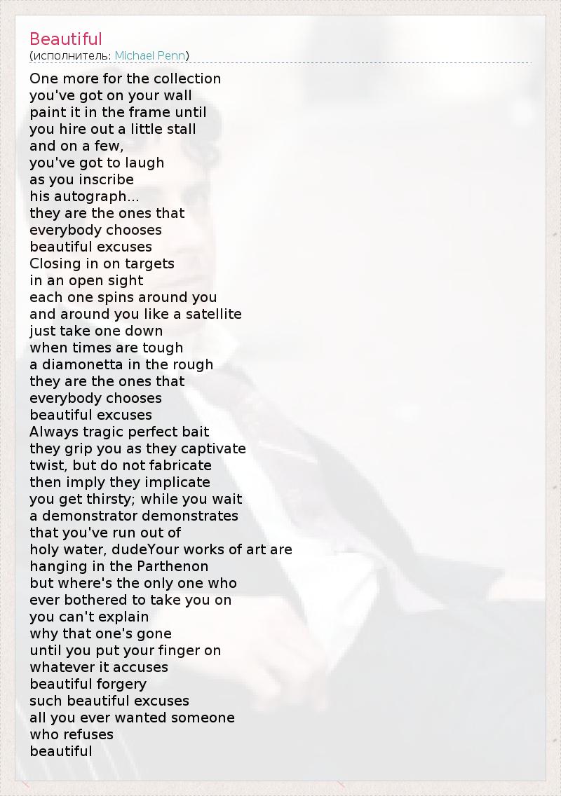 One more for the collection you've got on your wall paint it in the frame until you hire out a little stall and on a few, you've got to laugh as you inscribe his autograph... they are the ones that everybody chooses beautiful excuses Closing in on targets in an open sight each one spins around you and around you like a satellite just take one down when times are tough a diamonetta in the rough they are the ones that everybody chooses beautiful excuses Always tragic perfect bait they grip you as they captivate twist, but do not fabricate then imply they implicate you get thirsty; while you wait a demonstrator demonstrates that you've run out of holy water, dudeYour works of art are hanging in the Parthenon but where's the only one who ever bothered to take you on you can't explain why that one's gone until you put your finger on whatever it accuses beautiful forgery such beautiful excuses all you ever wanted someone who refuses beautiful