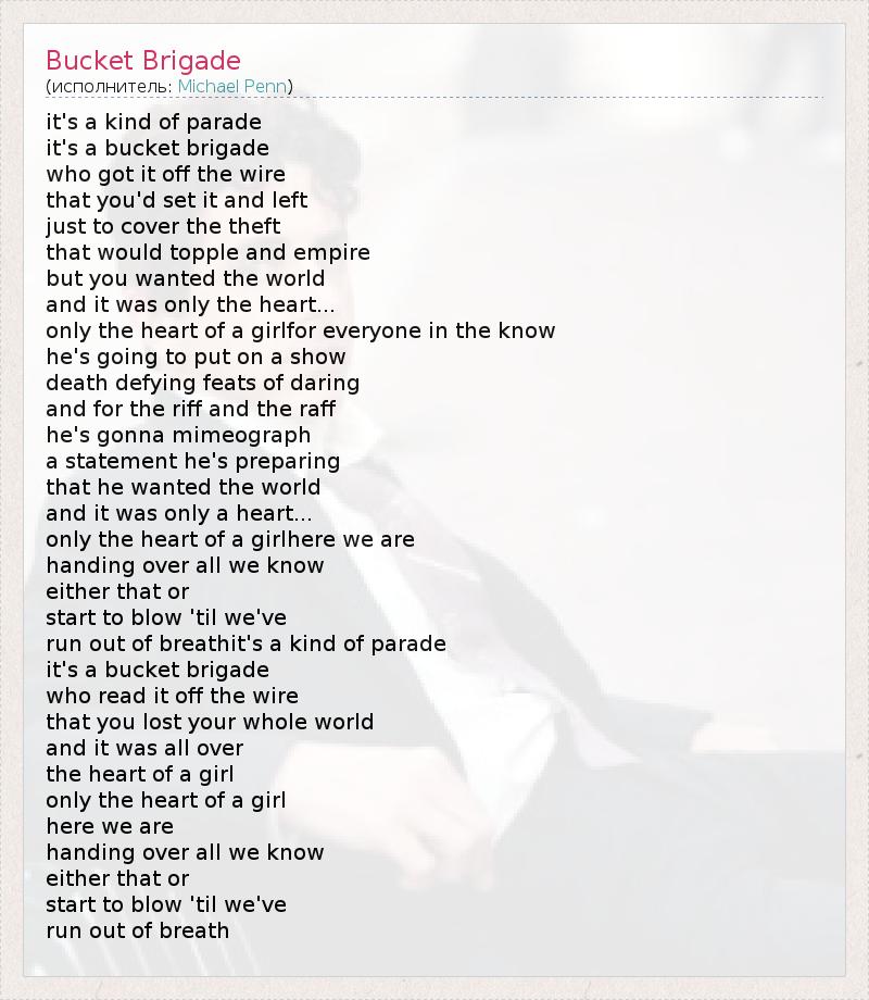 it's a kind of parade it's a bucket brigade who got it off the wire that you'd set it and left just to cover the theft that would topple and empire but you wanted the world and it was only the heart... only the heart of a girlfor everyone in the know he's going to put on a show death defying feats of daring and for the riff and the raff he's gonna mimeograph a statement he's preparing that he wanted the world and it was only a heart... only the heart of a girlhere we are handing over all we know either that or start to blow 'til we've run out of breathit's a kind of parade it's a bucket brigade who read it off the wire that you lost your whole world and it was all over the heart of a girl only the heart of a girl here we are handing over all we know either that or start to blow 'til we've run out of breath