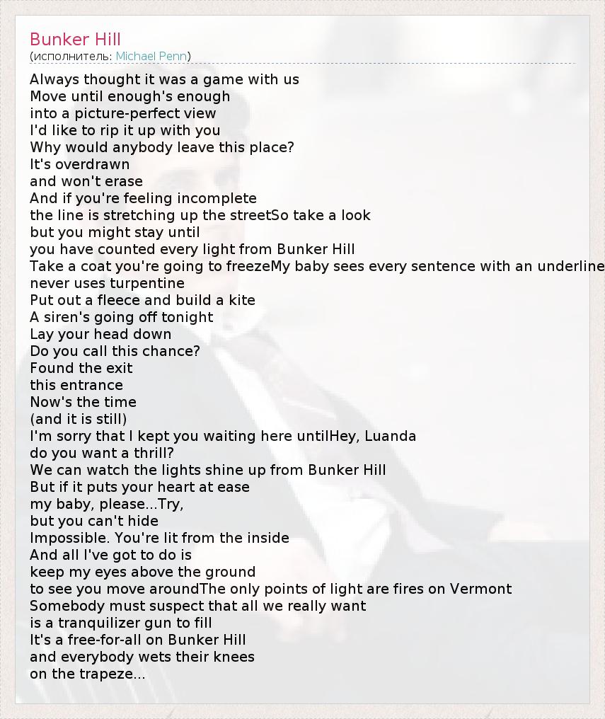 Always thought it was a game with us Move until enough's enough into a picture-perfect view I'd like to rip it up with you Why would anybody leave this place? It's overdrawn and won't erase And if you're feeling incomplete the line is stretching up the streetSo take a look but you might stay until you have counted every light from Bunker Hill Take a coat you're going to freezeMy baby sees every sentence with an underline never uses turpentine Put out a fleece and build a kite A siren's going off tonight Lay your head down Do you call this chance? Found the exit this entrance Now's the time (and it is still) I'm sorry that I kept you waiting here untilHey, Luanda do you want a thrill? We can watch the lights shine up from Bunker Hill But if it puts your heart at ease my baby, please...Try, but you can't hide Impossible. You're lit from the inside And all I've got to do is keep my eyes above the ground to see you move aroundThe only points of light are fires on Vermont Somebody must suspect that all we really want is a tranquilizer gun to fill It's a free-for-all on Bunker Hill and everybody wets their knees on the trapeze...