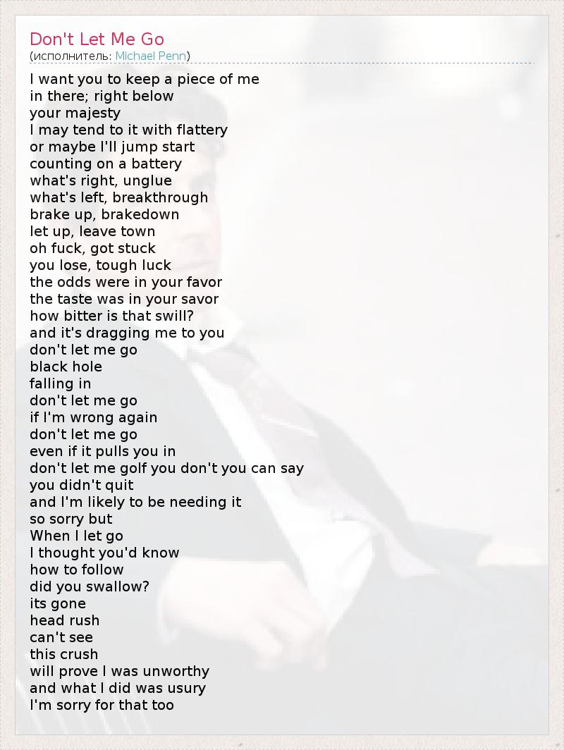 I want you to keep a piece of me in there; right below your majesty I may tend to it with flattery or maybe I'll jump start counting on a battery what's right, unglue what's left, breakthrough brake up, brakedown let up, leave town oh fuck, got stuck you lose, tough luck the odds were in your favor the taste was in your savor how bitter is that swill? and it's dragging me to you don't let me go black hole falling in don't let me go if I'm wrong again don't let me go even if it pulls you in don't let me goIf you don't you can say you didn't quit and I'm likely to be needing it so sorry but When I let go I thought you'd know how to follow did you swallow? its gone head rush can't see this crush will prove I was unworthy and what I did was usury I'm sorry for that too