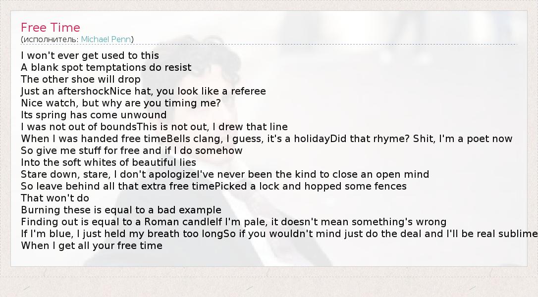 I won't ever get used to this A blank spot temptations do resist The other shoe will drop Just an aftershockNice hat, you look like a referee Nice watch, but why are you timing me? Its spring has come unwound I was not out of boundsThis is not out, I drew that line When I was handed free timeBells clang, I guess, it's a holidayDid that rhyme? Shit, I'm a poet now So give me stuff for free and if I do somehow Into the soft whites of beautiful lies Stare down, stare, I don't apologizeI've never been the kind to close an open mind So leave behind all that extra free timePicked a lock and hopped some fences That won't do Burning these is equal to a bad example Finding out is equal to a Roman candleIf I'm pale, it doesn't mean something's wrong If I'm blue, I just held my breath too longSo if you wouldn't mind just do the deal and I'll be real sublime When I get all your free time