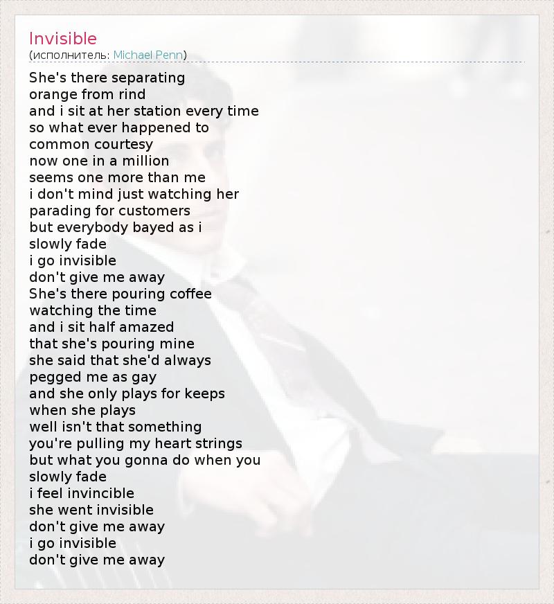 She's there separating orange from rind and i sit at her station every time so what ever happened to common courtesy now one in a million seems one more than me i don't mind just watching her parading for customers but everybody bayed as i slowly fade i go invisible don't give me away She's there pouring coffee watching the time and i sit half amazed that she's pouring mine she said that she'd always pegged me as gay and she only plays for keeps when she plays well isn't that something you're pulling my heart strings but what you gonna do when you slowly fade i feel invincible she went invisible don't give me away i go invisible don't give me away