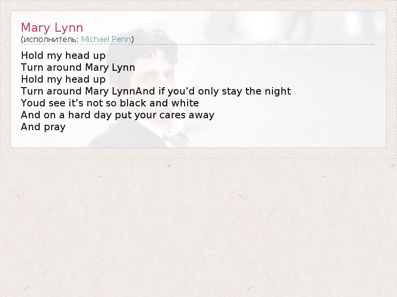 Hold my head up Turn around Mary Lynn Hold my head up Turn around Mary LynnAnd if you'd only stay the night Youd see it's not so black and white And on a hard day put your cares away And pray