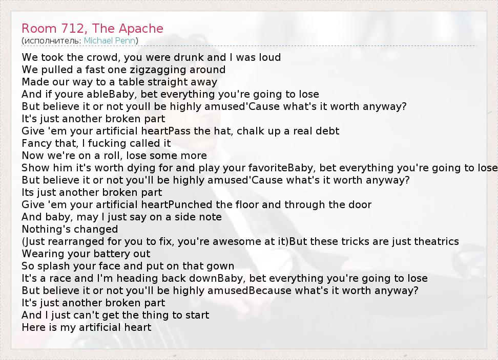 А как ты думаешь, о чем песня "Room 712, The Apache" ?