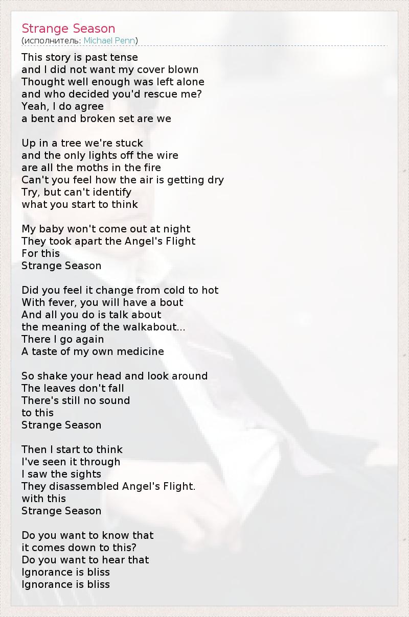 This story is past tense and I did not want my cover blown Thought well enough was left alone and who decided you'd rescue me? Yeah, I do agree a bent and broken set are we Up in a tree we're stuck and the only lights off the wire are all the moths in the fire Can't you feel how the air is getting dry Try, but can't identify what you start to think My baby won't come out at night They took apart the Angel's Flight For this Strange Season Did you feel it change from cold to hot With fever, you will have a bout And all you do is talk about the meaning of the walkabout... There I go again A taste of my own medicine So shake your head and look around The leaves don't fall There's still no sound to this Strange Season Then I start to think I've seen it through I saw the sights They disassembled Angel's Flight. with this Strange Season Do you want to know that it comes down to this? Do you want to hear that Ignorance is bliss Ignorance is bliss