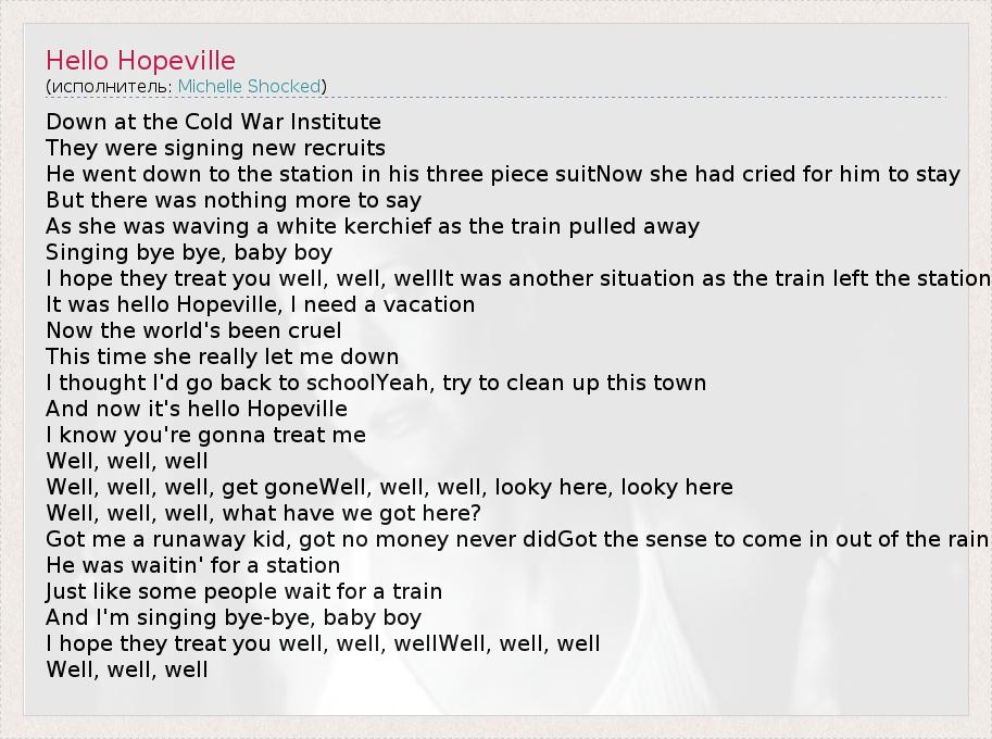 Down at the Cold War Institute They were signing new recruits He went down to the station in his three piece suitNow she had cried for him to stay But there was nothing more to say As she was waving a white kerchief as the train pulled away Singing bye bye, baby boy I hope they treat you well, well, wellIt was another situation as the train left the station It was hello Hopeville, I need a vacation Now the world's been cruel This time she really let me down I thought I'd go back to schoolYeah, try to clean up this town And now it's hello Hopeville I know you're gonna treat me Well, well, well Well, well, well, get goneWell, well, well, looky here, looky here Well, well, well, what have we got here? Got me a runaway kid, got no money never didGot the sense to come in out of the rain He was waitin' for a station Just like some people wait for a train And I'm singing bye-bye, baby boy I hope they treat you well, well, wellWell, well, well Well, well, well