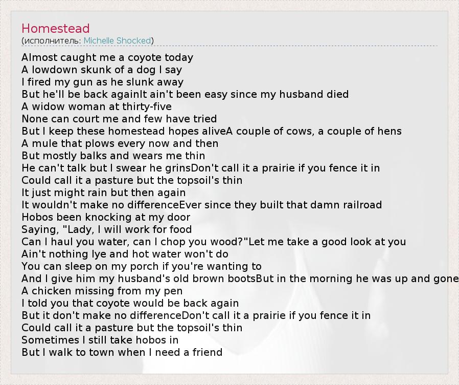 Almost caught me a coyote today A lowdown skunk of a dog I say I fired my gun as he slunk away But he'll be back againIt ain't been easy since my husband died A widow woman at thirty-five None can court me and few have tried But I keep these homestead hopes aliveA couple of cows, a couple of hens A mule that plows every now and then But mostly balks and wears me thin He can't talk but I swear he grinsDon't call it a prairie if you fence it in Could call it a pasture but the topsoil's thin It just might rain but then again It wouldn't make no differenceEver since they built that damn railroad Hobos been knocking at my door Saying, "Lady, I will work for food Can I haul you water, can I chop you wood?"Let me take a good look at you Ain't nothing lye and hot water won't do You can sleep on my porch if you're wanting to And I give him my husband's old brown bootsBut in the morning he was up and gone A chicken missing from my pen I told you that coyote would be back again But it don't make no differenceDon't call it a prairie if you fence it in Could call it a pasture but the topsoil's thin Sometimes I still take hobos in But I walk to town when I need a friend