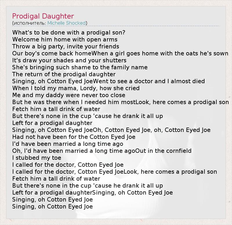 What's to be done with a prodigal son? Welcome him home with open arms Throw a big party, invite your friends Our boy's come back homeWhen a girl goes home with the oats he's sown It's draw your shades and your shutters She's bringing such shame to the family name The return of the prodigal daughter Singing, oh Cotton Eyed JoeWent to see a doctor and I almost died When I told my mama, Lordy, how she cried Me and my daddy were never too close But he was there when I needed him mostLook, here comes a prodigal son Fetch him a tall drink of water But there's none in the cup 'cause he drank it all up Left for a prodigal daughter Singing, oh Cotton Eyed JoeOh, Cotton Eyed Joe, oh, Cotton Eyed Joe Had not have been for the Cotton Eyed Joe I'd have been married a long time ago Oh, I'd have been married a long time agoOut in the cornfield I stubbed my toe I called for the doctor, Cotton Eyed Joe I called for the doctor, Cotton Eyed JoeLook, here comes a prodigal son Fetch him a tall drink of water But there's none in the cup 'cause he drank it all up Left for a prodigal daughterSinging, oh Cotton Eyed Joe Singing, oh Cotton Eyed Joe Singing, oh Cotton Eyed Joe