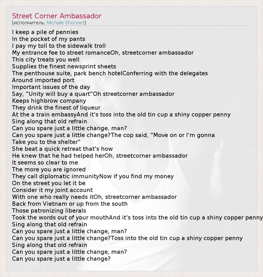 А как ты думаешь, о чем песня "Street Corner Ambassador" ?