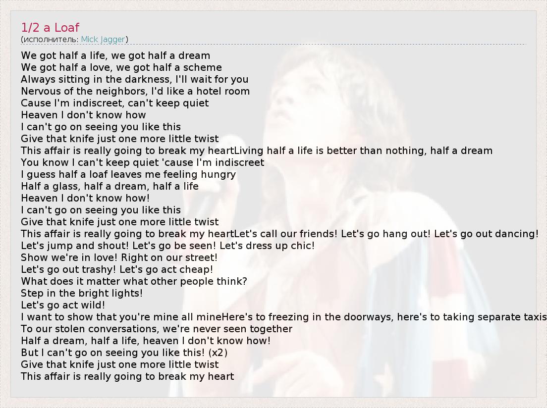 А как ты думаешь, о чем песня "1/2 a Loaf" ?