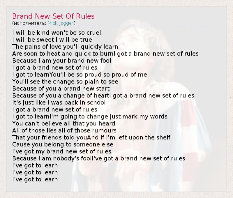 I will be kind won't be so cruel I will be sweet I will be true The pains of love you'll quickly learn Are soon to heat and quick to burnI got a brand new set of rules Because I am your brand new fool I got a brand new set of rules I got to learnYou'll be so proud so proud of me You'll see the change so plain to see Because of you a brand new start Because of you a change of heartI got a brand new set of rules It's just like I was back in school I got a brand new set of rules I got to learnI'm going to change just mark my words You can't believe all that you heard All of those lies all of those rumours That your friends told youAnd if I'm left upon the shelf Cause you belong to someone else I've got my brand new set of rules Because I am nobody's foolI've got a brand new set of rules I've got to learn I've got to learn I've got to learn
