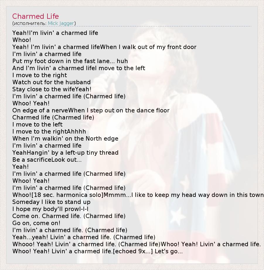 Yeah!I'm livin' a charmed life Whoo! Yeah! I'm livin' a charmed lifeWhen I walk out of my front door I'm livin' a charmed life Put my foot down in the fast lane... huh And I'm livin' a charmed lifeI move to the left I move to the right Watch out for the husband Stay close to the wifeYeah! I'm livin' a charmed life (Charmed life) Whoo! Yeah! On edge of a nerveWhen I step out on the dance floor Charmed life (Charmed life) I move to the left I move to the rightAhhhh When I'm walkin' on the North edge I'm livin' a charmed life YeahHangin' by a left-up tiny thread Be a sacrificeLook out... Yeah! I'm livin' a charmed life (Charmed life) Whoo! Yeah! I'm livin' a charmed life (Charmed life) Whoo![18 sec. harmonica solo]Mmmm...I like to keep my head way down in this town Someday I like to stand up I hope my body'll prowl-l-l Come on. Charmed life. (Charmed life) Go on, come on! I'm livin' a charmed life. (Charmed life) Yeah...yeah! Livin' a charmed life. (Charmed life) Whooo! Yeah! Livin' a charmed life. (Charmed life)Whoo! Yeah! Livin' a charmed life. Whoo! Yeah! Livin' a charmed life.[echoed 9x...] Let's go...
