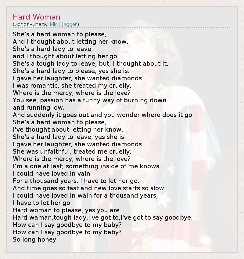 She's a hard woman to please, And I thought about letting her know. She's a hard lady to leave, and I thought about letting her go. She's a tough lady to leave, but, i thought about it. She's a hard lady to please, yes she is. I gave her laughter, she wanted diamonds. I was romantic, she treated my cruelly. Where is the mercy, where is the love? You see, passion has a funny way of burning down and running low. And suddenly it goes out and you wonder where does it go. She's a hard woman to please, I've thought about letting her know. She's a hard lady to leave, yes she is. I gave her laughter, she wanted diamonds. She was unfaithful, treated me cruelly. Where is the mercy, where is the love? I'm alone at last; something inside of me knows I could have loved in vain For a thousand years. I have to let her go. And time goes so fast and new love starts so slow. I could have loved in wain for a thousand years, I have to let her go. Hard woman to please, yes you are. Hard waman,tough lady,I've got to,I've got to say goodbye. How can I say goodbye to my baby? How can I say goodbye to my baby? So long honey.