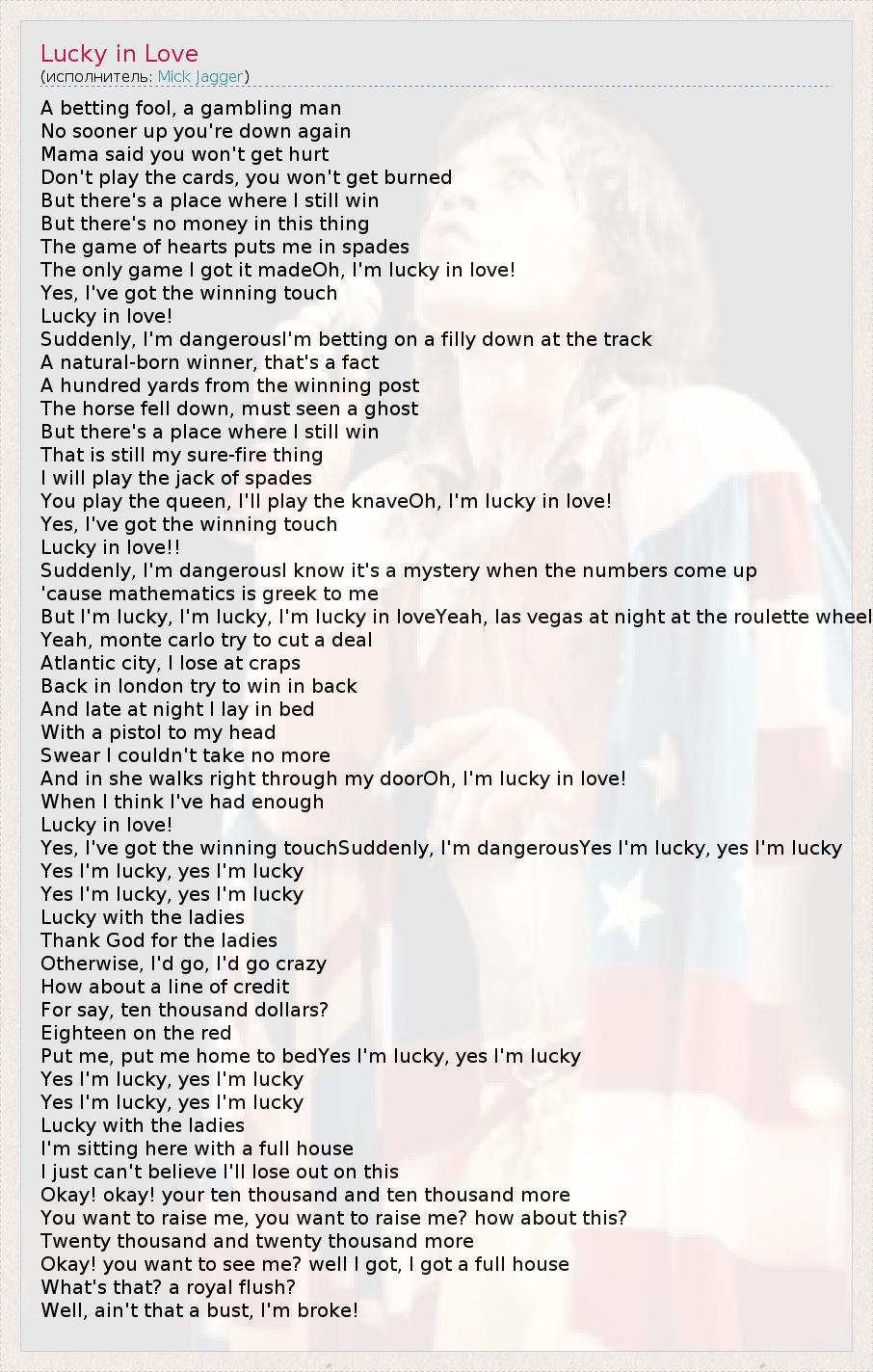 A betting fool, a gambling man No sooner up you're down again Mama said you won't get hurt Don't play the cards, you won't get burned But there's a place where I still win But there's no money in this thing The game of hearts puts me in spades The only game I got it madeOh, I'm lucky in love! Yes, I've got the winning touch Lucky in love! Suddenly, I'm dangerousI'm betting on a filly down at the track A natural-born winner, that's a fact A hundred yards from the winning post The horse fell down, must seen a ghost But there's a place where I still win That is still my sure-fire thing I will play the jack of spades You play the queen, I'll play the knaveOh, I'm lucky in love! Yes, I've got the winning touch Lucky in love!! Suddenly, I'm dangerousI know it's a mystery when the numbers come up 'cause mathematics is greek to me But I'm lucky, I'm lucky, I'm lucky in loveYeah, las vegas at night at the roulette wheel Yeah, monte carlo try to cut a deal Atlantic city, I lose at craps Back in london try to win in back And late at night I lay in bed With a pistol to my head Swear I couldn't take no more And in she walks right through my doorOh, I'm lucky in love! When I think I've had enough Lucky in love! Yes, I've got the winning touchSuddenly, I'm dangerousYes I'm lucky, yes I'm lucky Yes I'm lucky, yes I'm lucky Yes I'm lucky, yes I'm lucky Lucky with the ladies Thank God for the ladies Otherwise, I'd go, I'd go crazy How about a line of credit For say, ten thousand dollars? Eighteen on the red Put me, put me home to bedYes I'm lucky, yes I'm lucky Yes I'm lucky, yes I'm lucky Yes I'm lucky, yes I'm lucky Lucky with the ladies I'm sitting here with a full house I just can't believe I'll lose out on this Okay! okay! your ten thousand and ten thousand more You want to raise me, you want to raise me? how about this? Twenty thousand and twenty thousand more Okay! you want to see me? well I got, I got a full house What's that? a royal flush? Well, ain't that a bust, I'm broke!