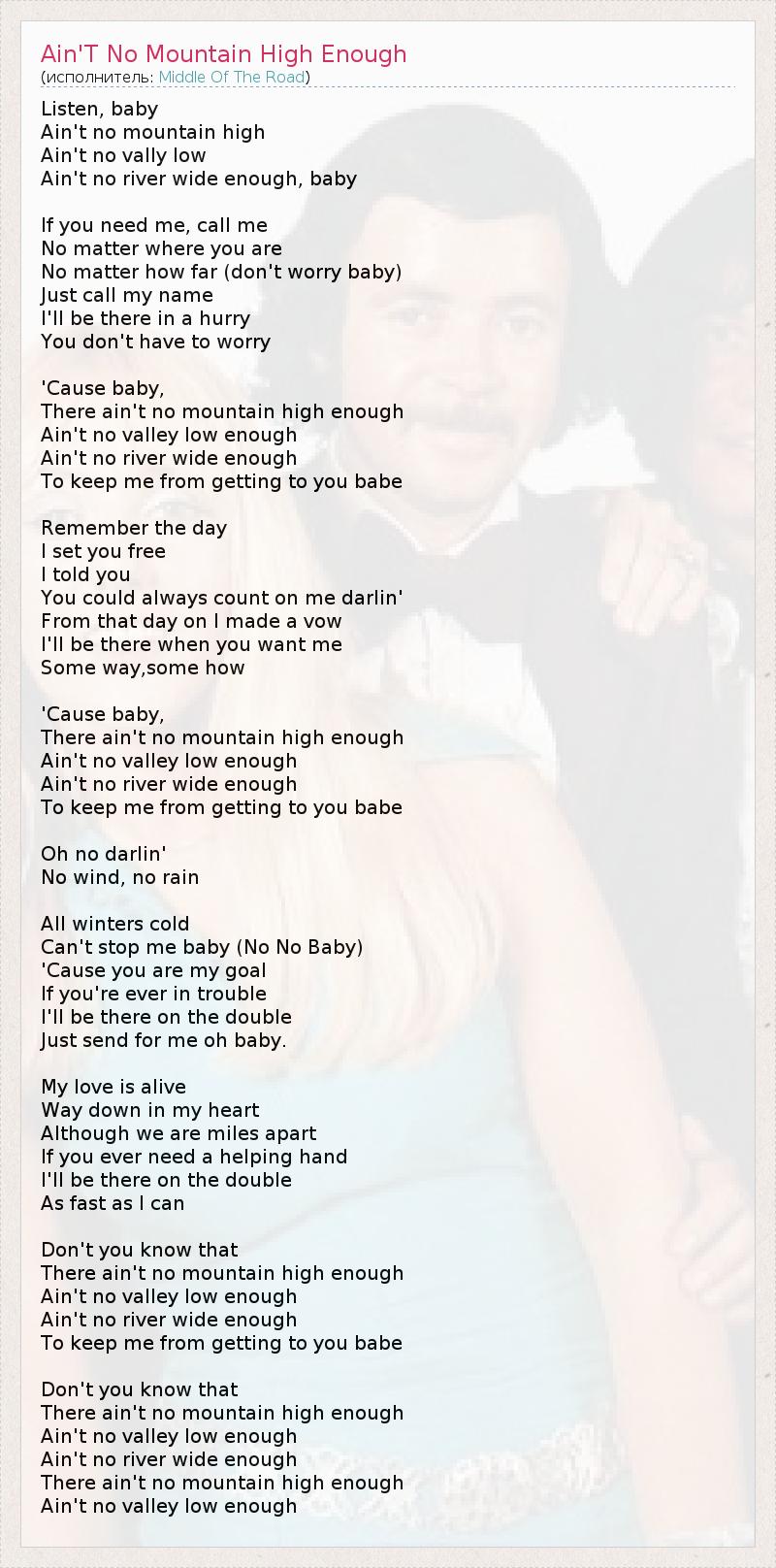 Listen, baby Ain't no mountain high Ain't no vally low Ain't no river wide enough, baby If you need me, call me No matter where you are No matter how far (don't worry baby) Just call my name I'll be there in a hurry You don't have to worry 'Cause baby, There ain't no mountain high enough Ain't no valley low enough Ain't no river wide enough To keep me from getting to you babe Remember the day I set you free I told you You could always count on me darlin' From that day on I made a vow I'll be there when you want me Some way,some how 'Cause baby, There ain't no mountain high enough Ain't no valley low enough Ain't no river wide enough To keep me from getting to you babe Oh no darlin' No wind, no rain All winters cold Can't stop me baby (No No Baby) 'Cause you are my goal If you're ever in trouble I'll be there on the double Just send for me oh baby. My love is alive Way down in my heart Although we are miles apart If you ever need a helping hand I'll be there on the double As fast as I can Don't you know that There ain't no mountain high enough Ain't no valley low enough Ain't no river wide enough To keep me from getting to you babe Don't you know that There ain't no mountain high enough Ain't no valley low enough Ain't no river wide enough There ain't no mountain high enough Ain't no valley low enough