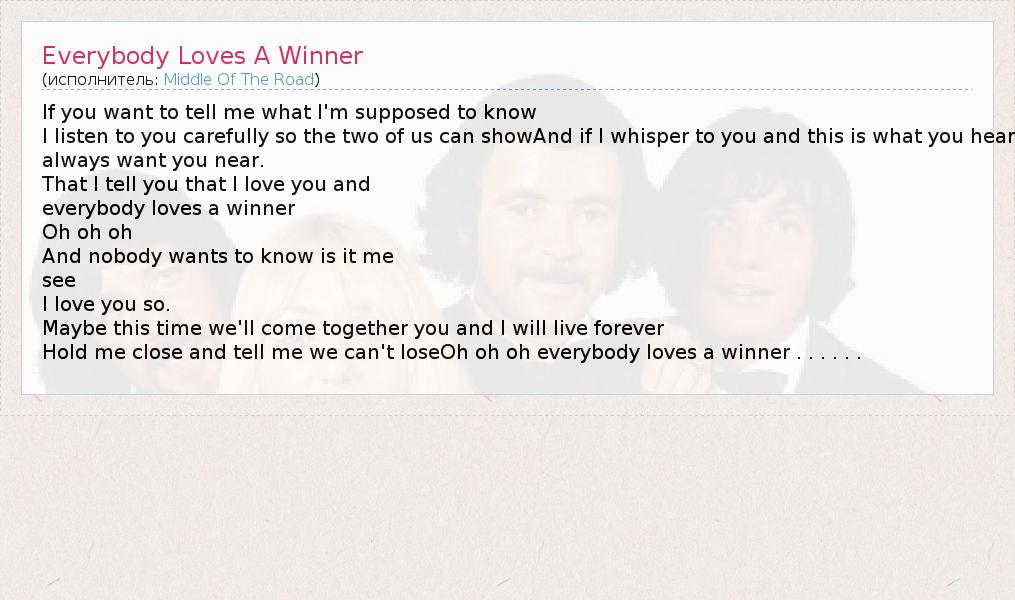 If you want to tell me what I'm supposed to know I listen to you carefully so the two of us can showAnd if I whisper to you and this is what you hear always want you near. That I tell you that I love you and everybody loves a winner Oh oh oh And nobody wants to know is it me see I love you so. Maybe this time we'll come together you and I will live forever Hold me close and tell me we can't loseOh oh oh everybody loves a winner . . . . . .