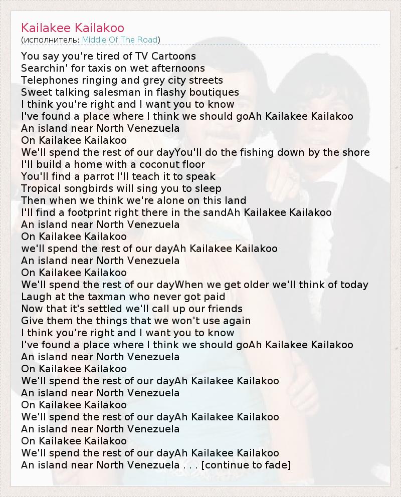 You say you're tired of TV Cartoons Searchin' for taxis on wet afternoons Telephones ringing and grey city streets Sweet talking salesman in flashy boutiques I think you're right and I want you to know I've found a place where I think we should goAh Kailakee Kailakoo An island near North Venezuela On Kailakee Kailakoo We'll spend the rest of our dayYou'll do the fishing down by the shore I'll build a home with a coconut floor You'll find a parrot I'll teach it to speak Tropical songbirds will sing you to sleep Then when we think we're alone on this land I'll find a footprint right there in the sandAh Kailakee Kailakoo An island near North Venezuela On Kailakee Kailakoo we'll spend the rest of our dayAh Kailakee Kailakoo An island near North Venezuela On Kailakee Kailakoo We'll spend the rest of our dayWhen we get older we'll think of today Laugh at the taxman who never got paid Now that it's settled we'll call up our friends Give them the things that we won't use again I think you're right and I want you to know I've found a place where I think we should goAh Kailakee Kailakoo An island near North Venezuela On Kailakee Kailakoo We'll spend the rest of our dayAh Kailakee Kailakoo An island near North Venezuela On Kailakee Kailakoo We'll spend the rest of our dayAh Kailakee Kailakoo An island near North Venezuela On Kailakee Kailakoo We'll spend the rest of our dayAh Kailakee Kailakoo An island near North Venezuela . . . [continue to fade]