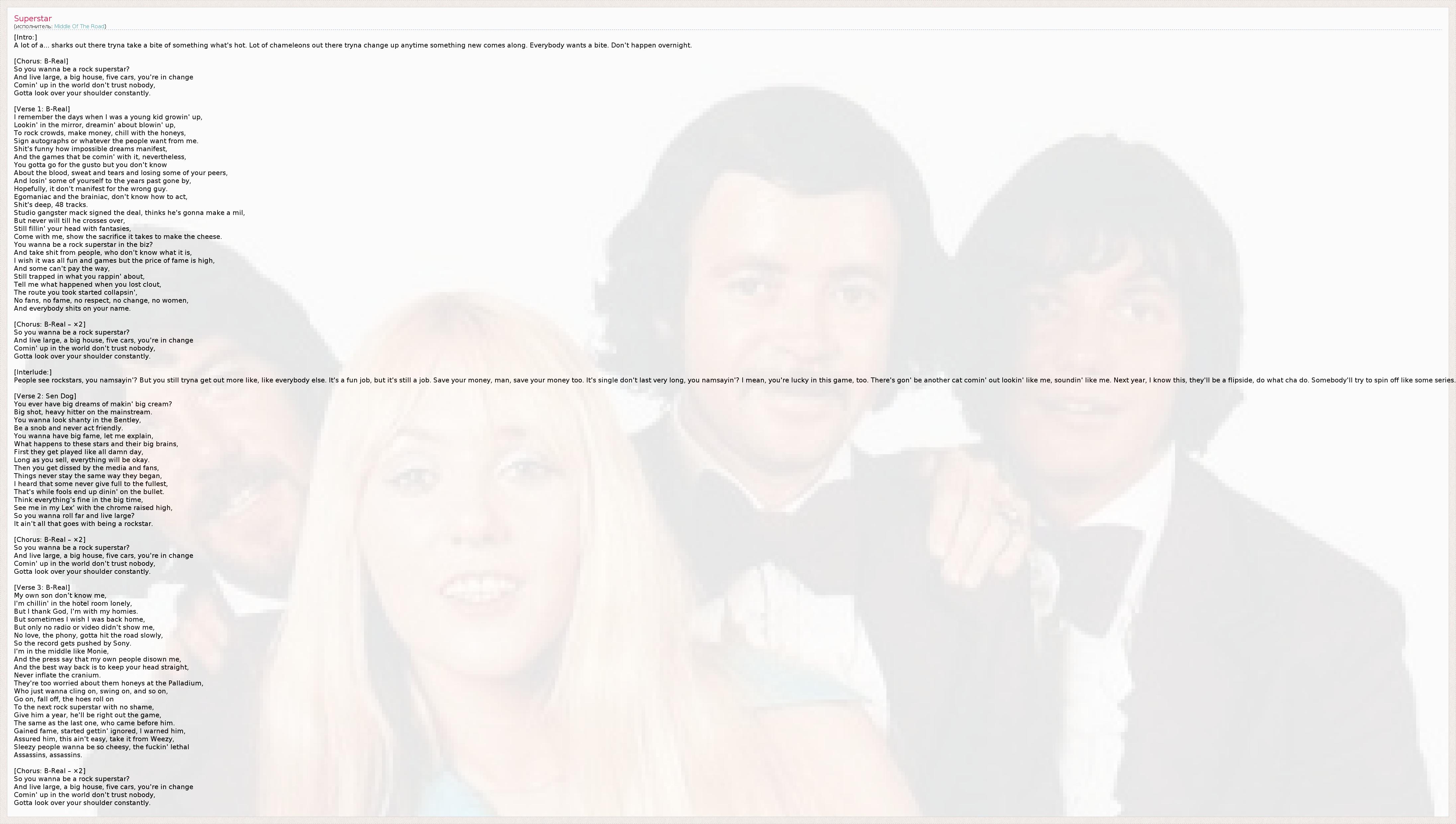 [Вступление:] Тут куча акул, которые так и норовят отхватить кусок чего получше. Тут толпы хамелеонов, которые пытаются подстроиться, как только появляется что-то новое. Все хотят кусок себе. Но такое не происходит в одночасье. [Припев: B-Real] Значит, хочешь быть рок-звездой? Жить на широкую ногу в большом доме, иметь пять машин, быть главным? Не верь никому, продвигаясь в этом мире, Ты должен постоянно оглядываться. [Куплет 1: B-Real] Помню то время, когда я был пацанёнком, Смотрел в зеркало и мечтал о том, как прославлюсь, Качать толпу, зарабатывать деньги, кайфовать с красотками, Раздавать автографы или чего там от меня хочет народ. Ржачно, как проявляются невозможные мечты, А ещё игры, что приходят с ними, но, тем не менее, Ты должен тянуться к силе, но ты и понятия не имеешь О крови, поте и слезах, о том, что потеряешь пару друзей, И частичка тебя растворится в ушедших годах, Надеюсь, это не послужит доказательством для неподходящего парня. Эгоист и умник — не знаю, как себя вести, Это серьёзная тема, 48 песен. Студийный гангстер-фраерок подписал контракт, решил, что заработает миллион, Но он так и будет колотиться до смерти, Ты всё ещё забиваешь себе голову фантазиями, Пойдём со мной, я покажу, на какие жертвы приходится идти ради бабла. Хочешь стать рок-звездой в шоу-бизнесе? Чтобы тебя поливали де**мом те, кто ничего об этом не знает? Хотел бы я, чтобы всё это оказалось забавной игрой, но цена славы высока, Некоторые не могут рассчитаться И замыкаются в том, о чём ты говоришь, Расскажи, что случилось, когда ты потерял своего патрона, А выбранный маршрут накрылся: Ни фанатов, ни славы, ни уважения, ни перемен, ни женщин, И все смешивают твоё имя с де**мом. [Припев: B-Real – ×2] Значит, хочешь быть рок-звездой? Жить на широкую ногу в большом доме, иметь пять машин, быть главным? Не верь никому, продвигаясь в этом мире, Ты должен постоянно оглядываться. [Интерлюдия:] Люди видят рок-звёзд, втыкаешь, о чём я? Но вы всё равно пытаетесь добраться до большего, как... как все остальные. Это весёлая работа, но, всё равно, работа. Откладывай деньги, чувак, и береги их. Одна песня долго не протянет, втыкаешь, о чём я? Я к тому, что тебе здесь повезло. Но потом выдвинется и другой чувачок, похожий на меня, звучащий, как я. А на следующий год, я-то знаю, они отвернутся. Так что делай, что делаешь. Кто-то станет твоим продолжением, как в сериале. [Куплет 2: Sen Dog] У тебя когда-нибудь были большие мечты о больших деньгах? Большая шишка, заправляла в мейнстриме. Хочешь затмевать всех в "Бентли", Быть неприветливым снобом. Хочешь славы, но дай мне объяснить, Что случается со звёздами и их большими замыслами: Сперва им башляют по целым дням, Пока ты продаёшься всё на мази. Но потом тебя освистывают пресса и поклонники, Всё резко меняется, всё не так, как в начале, Я слышал, что кое-кто никак не может остановиться, Поэтому болваны и получают пулю на закуску. Думаешь, что у успешных всё ништяк, Видишь меня в "Лексусе" с хромированной решёткой, И хочешь поймать звезду и далеко пойти, Но рок-звёздам достаётся не только это... [Припев: B-Real – ×2] Значит, хочешь быть рок-звездой? Жить на широкую ногу в большом доме, иметь пять машин, быть главным? Не верь никому, продвигаясь в этом мире, Ты должен постоянно оглядываться. [Куплет 3: B-Real] Мой собственный сын не узнаёт меня, Я один сижу в гостиничном номере, Но, слава богу, у меня ест
