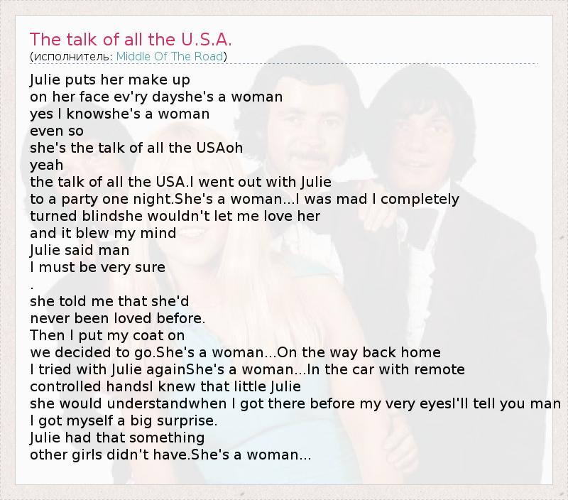 Julie puts her make up on her face ev'ry dayshe's a woman yes I knowshe's a woman even so she's the talk of all the USAoh yeah the talk of all the USA.I went out with Julie to a party one night.She's a woman...I was mad I completely turned blindshe wouldn't let me love her and it blew my mind Julie said man I must be very sure . she told me that she'd never been loved before. Then I put my coat on we decided to go.She's a woman...On the way back home I tried with Julie againShe's a woman...In the car with remote controlled handsI knew that little Julie she would understandwhen I got there before my very eyesI'll tell you man I got myself a big surprise. Julie had that something other girls didn't have.She's a woman...