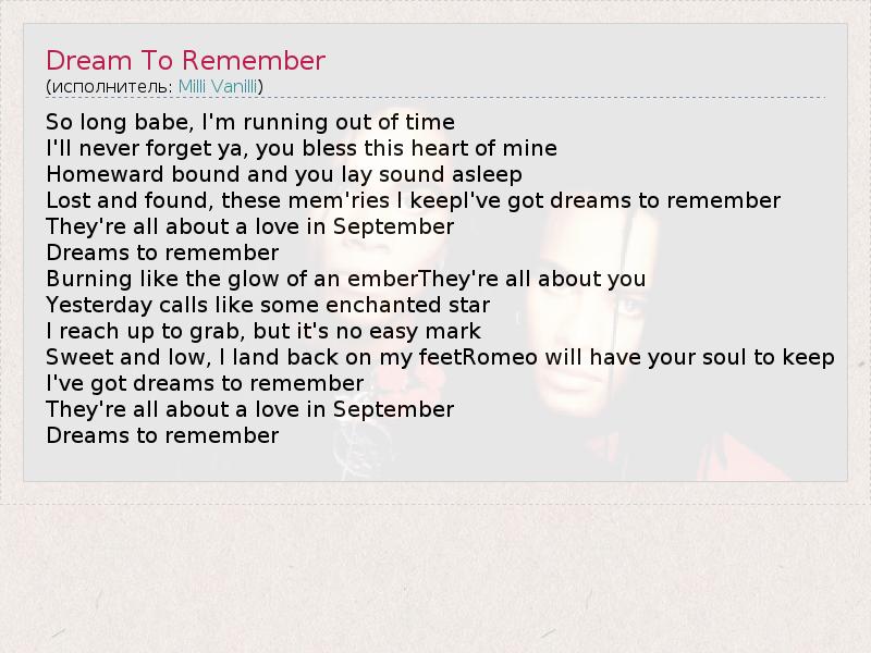 So long babe, I'm running out of time I'll never forget ya, you bless this heart of mine Homeward bound and you lay sound asleep Lost and found, these mem'ries I keepI've got dreams to remember They're all about a love in September Dreams to remember Burning like the glow of an emberThey're all about you Yesterday calls like some enchanted star I reach up to grab, but it's no easy mark Sweet and low, I land back on my feetRomeo will have your soul to keep I've got dreams to remember They're all about a love in September Dreams to remember