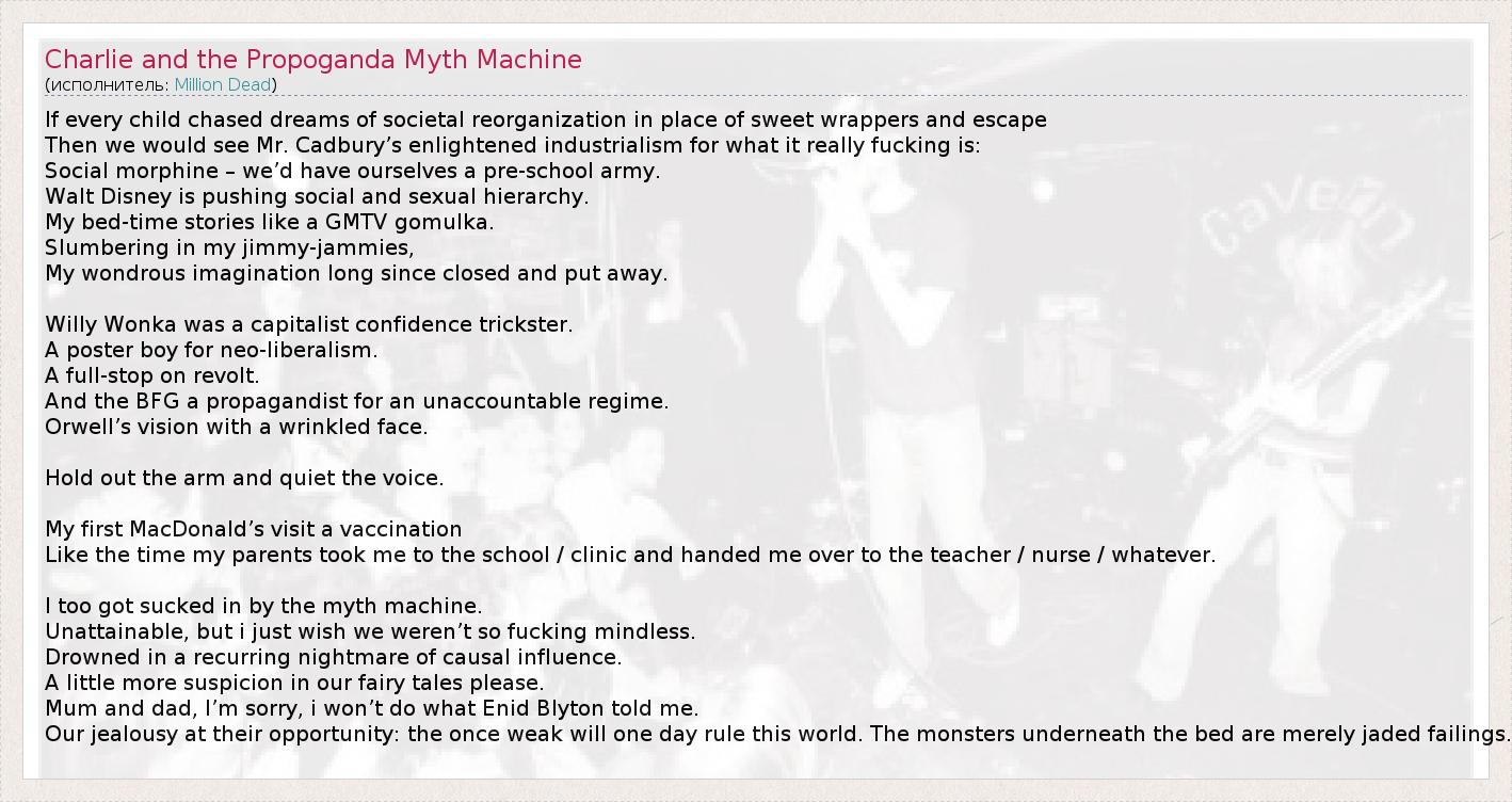 А как ты думаешь, о чем песня "Charlie and the Propoganda Myth Machine" ?