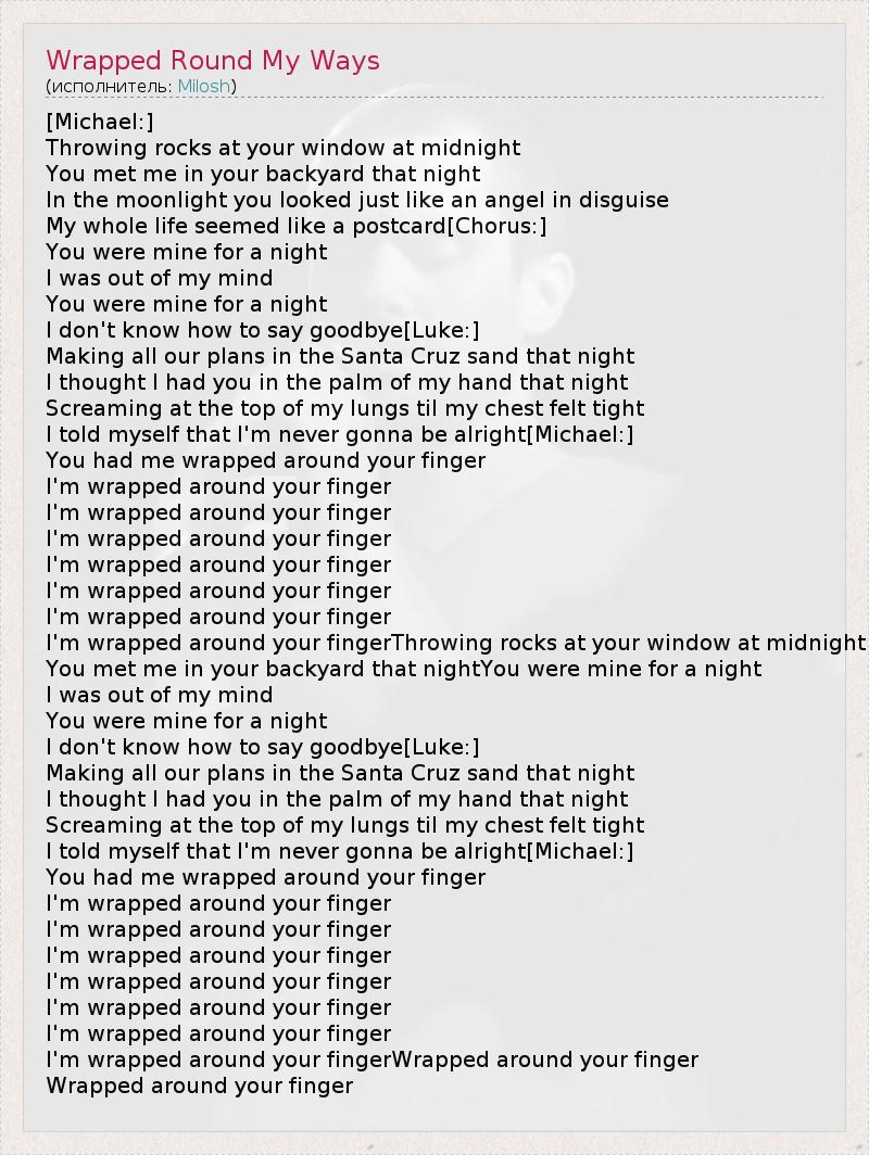 [Michael:] Throwing rocks at your window at midnight You met me in your backyard that night In the moonlight you looked just like an angel in disguise My whole life seemed like a postcard[Chorus:] You were mine for a night I was out of my mind You were mine for a night I don't know how to say goodbye[Luke:] Making all our plans in the Santa Cruz sand that night I thought I had you in the palm of my hand that night Screaming at the top of my lungs til my chest felt tight I told myself that I'm never gonna be alright[Michael:] You had me wrapped around your finger I'm wrapped around your finger I'm wrapped around your finger I'm wrapped around your finger I'm wrapped around your finger I'm wrapped around your finger I'm wrapped around your finger I'm wrapped around your fingerThrowing rocks at your window at midnight You met me in your backyard that nightYou were mine for a night I was out of my mind You were mine for a night I don't know how to say goodbye[Luke:] Making all our plans in the Santa Cruz sand that night I thought I had you in the palm of my hand that night Screaming at the top of my lungs til my chest felt tight I told myself that I'm never gonna be alright[Michael:] You had me wrapped around your finger I'm wrapped around your finger I'm wrapped around your finger I'm wrapped around your finger I'm wrapped around your finger I'm wrapped around your finger I'm wrapped around your finger I'm wrapped around your fingerWrapped around your finger Wrapped around your finger