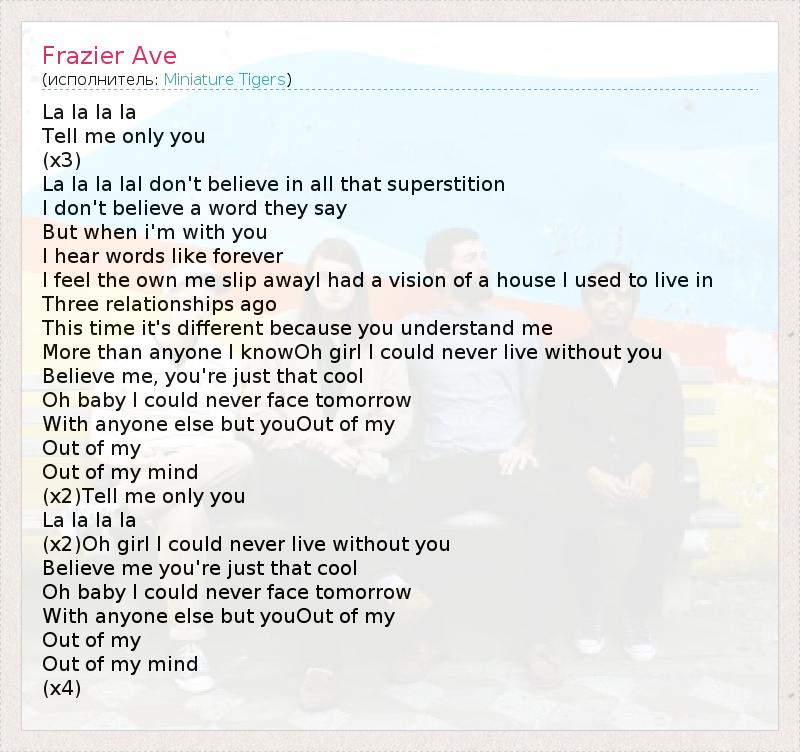 La la la la Tell me only you (x3) La la la laI don't believe in all that superstition I don't believe a word they say But when i'm with you I hear words like forever I feel the own me slip awayI had a vision of a house I used to live in Three relationships ago This time it's different because you understand me More than anyone I knowOh girl I could never live without you Believe me, you're just that cool Oh baby I could never face tomorrow With anyone else but youOut of my Out of my Out of my mind (x2)Tell me only you La la la la (x2)Oh girl I could never live without you Believe me you're just that cool Oh baby I could never face tomorrow With anyone else but youOut of my Out of my Out of my mind (x4)