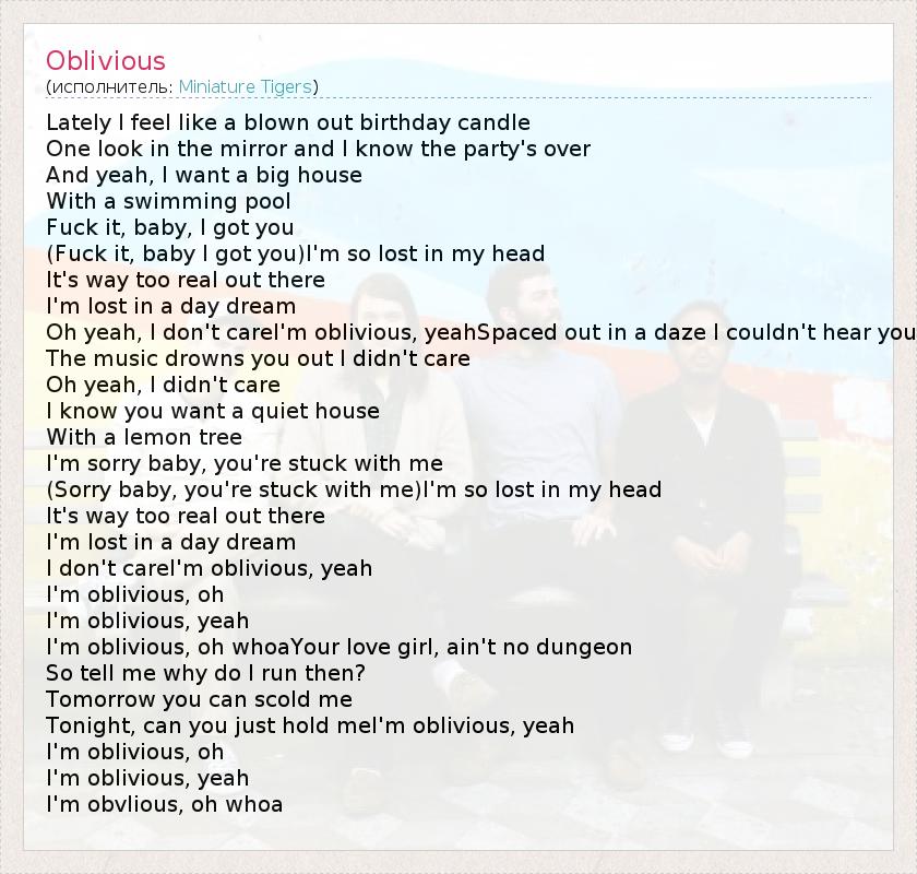 Lately I feel like a blown out birthday candle One look in the mirror and I know the party's over And yeah, I want a big house With a swimming pool Fuck it, baby, I got you (Fuck it, baby I got you)I'm so lost in my head It's way too real out there I'm lost in a day dream Oh yeah, I don't careI'm oblivious, yeahSpaced out in a daze I couldn't hear you The music drowns you out I didn't care Oh yeah, I didn't care I know you want a quiet house With a lemon tree I'm sorry baby, you're stuck with me (Sorry baby, you're stuck with me)I'm so lost in my head It's way too real out there I'm lost in a day dream I don't careI'm oblivious, yeah I'm oblivious, oh I'm oblivious, yeah I'm oblivious, oh whoaYour love girl, ain't no dungeon So tell me why do I run then? Tomorrow you can scold me Tonight, can you just hold meI'm oblivious, yeah I'm oblivious, oh I'm oblivious, yeah I'm obvlious, oh whoa