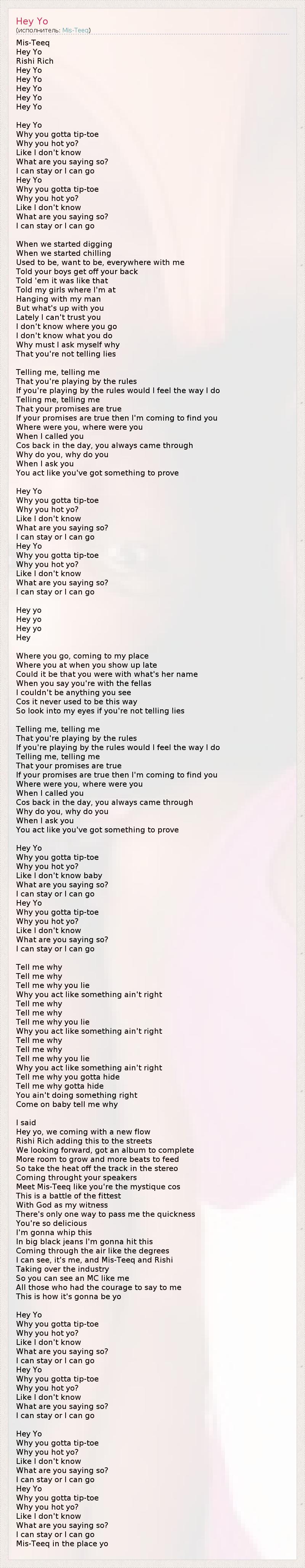 Mis-Teeq Hey Yo Rishi Rich Hey Yo Hey Yo Hey Yo Hey Yo Hey Yo Hey Yo Why you gotta tip-toe Why you hot yo? Like I don't know What are you saying so? I can stay or I can go Hey Yo Why you gotta tip-toe Why you hot yo? Like I don't know What are you saying so? I can stay or I can go When we started digging When we started chilling Used to be, want to be, everywhere with me Told your boys get off your back Told 'em it was like that Told my girls where I'm at Hanging with my man But what's up with you Lately I can't trust you I don't know where you go I don't know what you do Why must I ask myself why That you're not telling lies Telling me, telling me That you're playing by the rules If you're playing by the rules would I feel the way I do Telling me, telling me That your promises are true If your promises are true then I'm coming to find you Where were you, where were you When I called you Cos back in the day, you always came through Why do you, why do you When I ask you You act like you've got something to prove Hey Yo Why you gotta tip-toe Why you hot yo? Like I don't know What are you saying so? I can stay or I can go Hey Yo Why you gotta tip-toe Why you hot yo? Like I don't know What are you saying so? I can stay or I can go Hey yo Hey yo Hey yo Hey Where you go, coming to my place Where you at when you show up late Could it be that you were with what's her name When you say you're with the fellas I couldn't be anything you see Cos it never used to be this way So look into my eyes if you're not telling lies Telling me, telling me That you're playing by the rules If you're playing by the rules would I feel the way I do Telling me, telling me That your promises are true If your promises are true then I'm coming to find you Where were you, where were you When I called you Cos back in the day, you always came through Why do you, why do you When I ask you You act like you've got something to prove Hey Yo Why you gotta tip-toe Why you hot yo? Like I don't know baby What are you saying so? I can stay or I can go Hey Yo Why you gotta tip-toe Why you hot yo? Like I don't know What are you saying so? I can stay or I can go Tell me why Tell me why Tell me why you lie Why you act like something ain't right Tell me why Tell me why Tell me why you lie Why you act like something ain't right Tell me why Tell me why Tell me why you lie Why you act like something ain't right Tell me why you gotta hide Tell me why gotta hide You ain't doing something right Come on baby tell me why I said Hey yo, we coming with a new flow Rishi Rich adding this to the streets We looking forward, got an album to complete More room to grow and more beats to feed So take the heat off the track in the stereo Coming throught your speakers Meet Mis-Teeq like you're the mystique cos This is a battle of the fittest With God as my witness There's only one way to pass me the quickness You're so delicious I'm gonna whip this In big black jeans I'm gonna hit this Coming through the air like the degrees I can see, it's me, and Mis-Teeq and Rishi Taking over the industry So you can see an MC like me All those who had the courage to say to me This is how it's gonna be yo Hey Yo Why you gotta tip-toe Why you hot yo? Like I don't know What are you saying so? I can stay or I can go Hey Yo Why you gotta tip-toe Why you hot yo? Like I don't know What are you saying so? I can stay or I can go Hey Yo Why you gotta tip-toe Why you hot yo? Like I don't know What are you saying so? I can stay or I can go Hey Yo Why you gotta tip-toe Why you hot yo? Like I don't know What are you saying so? I can stay or I can go Mis-Teeq in the place yo