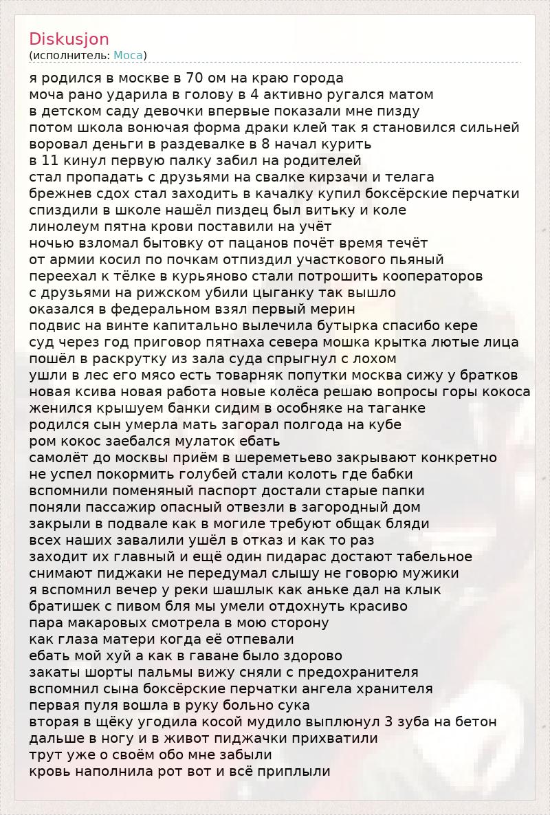 я родился в москве в 70 ом на краю города моча рано ударила в голову в 4 активно ругался матом в детском саду девочки впервые показали мне пизду потом школа вонючая форма драки клей так я становился сильней воровал деньги в раздевалке в 8 начал курить в 11 кинул первую палку забил на родителей стал пропадать с друзьями на свалке кирзачи и телага брежнев сдох стал заходить в качалку купил боксёрские перчатки спиздили в школе нашёл пиздец был витьку и коле линолеум пятна крови поставили на учёт ночью взломал бытовку от пацанов почёт время течёт от армии косил по почкам отпиздил участкового пьяный переехал к тёлке в курьяново стали потрошить кооператоров с друзьями на рижском убили цыганку так вышло оказался в федеральном взял первый мерин подвис на винте капитально вылечила бутырка спасибо кере суд через год приговор пятнаха севера мошка крытка лютые лица пошёл в раскрутку из зала суда спрыгнул с лохом ушли в лес его мясо есть товарняк попутки москва сижу у братков новая ксива новая работа новые колёса решаю вопросы горы кокоса женился крышуем банки сидим в особняке на таганке родился сын умерла мать загорал полгода на кубе ром кокос заебался мулаток ебать самолёт до москвы приём в шереметьево закрывают конкретно не успел покормить голубей стали колоть где бабки вспомнили поменяный паспорт достали старые папки поняли пассажир опасный отвезли в загородный дом закрыли в подвале как в могиле требуют общак бляди всех наших завалили ушёл в отказ и как то раз заходит их главный и ещё один пидарас достают табельное снимают пиджаки не передумал слышу не говорю мужики я вспомнил вечер у реки шашлык как аньке дал на клык братишек с пивом бля мы умели отдохнуть красиво пара макаровых смотрела в мою сторону как глаза матери когда её отпевали ебать мой хуй а как в гаване было здорово закаты шорты пальмы вижу сняли с предохранителя вспомнил сына боксёрские перчатки ангела хранителя первая пуля вошла в руку больно сука вторая в щёку угодила косой мудило выплюнул 3 зуба на бетон дальше в ногу и в живот пиджачки прихватили трут уже о своём обо мне забыли кровь наполнила рот вот и всё приплыли