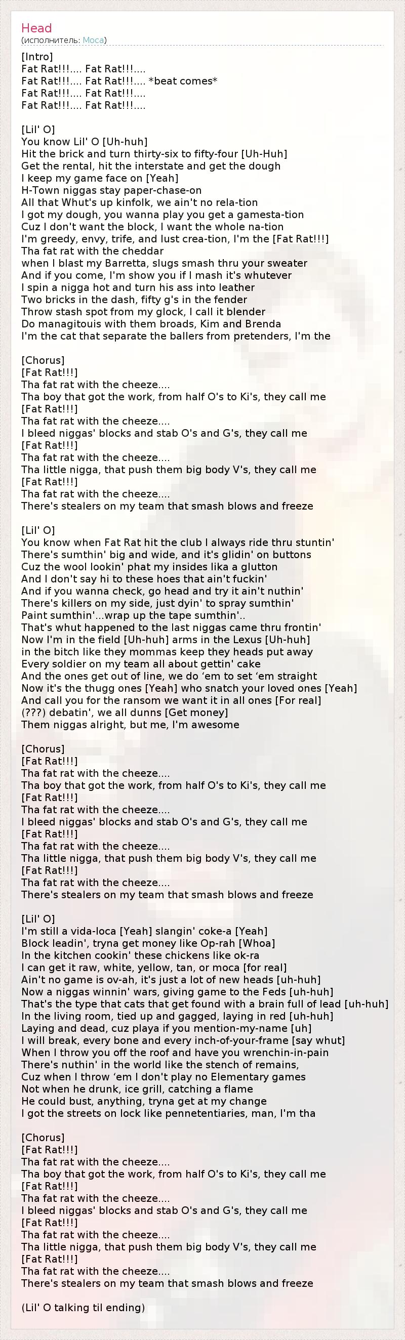 [Intro] Fat Rat!!!.... Fat Rat!!!.... Fat Rat!!!.... Fat Rat!!!.... *beat comes* Fat Rat!!!.... Fat Rat!!!.... Fat Rat!!!.... Fat Rat!!!.... [Lil' O] You know Lil' O [Uh-huh] Hit the brick and turn thirty-six to fifty-four [Uh-Huh] Get the rental, hit the interstate and get the dough I keep my game face on [Yeah] H-Town niggas stay paper-chase-on All that Whut's up kinfolk, we ain't no rela-tion I got my dough, you wanna play you get a gamesta-tion Cuz I don't want the block, I want the whole na-tion I'm greedy, envy, trife, and lust crea-tion, I'm the [Fat Rat!!!] Tha fat rat with the cheddar when I blast my Barretta, slugs smash thru your sweater And if you come, I'm show you if I mash it's whutever I spin a nigga hot and turn his ass into leather Two bricks in the dash, fifty g's in the fender Throw stash spot from my glock, I call it blender Do managitouis with them broads, Kim and Brenda I'm the cat that separate the ballers from pretenders, I'm the [Chorus] [Fat Rat!!!] Tha fat rat with the cheeze.... Tha boy that got the work, from half O's to Ki's, they call me [Fat Rat!!!] Tha fat rat with the cheeze.... I bleed niggas' blocks and stab O's and G's, they call me [Fat Rat!!!] Tha fat rat with the cheeze.... Tha little nigga, that push them big body V's, they call me [Fat Rat!!!] Tha fat rat with the cheeze.... There's stealers on my team that smash blows and freeze [Lil' O] You know when Fat Rat hit the club I always ride thru stuntin' There's sumthin' big and wide, and it's glidin' on buttons Cuz the wool lookin' phat my insides lika a glutton And I don't say hi to these hoes that ain't fuckin' And if you wanna check, go head and try it ain't nuthin' There's killers on my side, just dyin' to spray sumthin' Paint sumthin'...wrap up the tape sumthin'.. That's whut happened to the last niggas came thru frontin' Now I'm in the field [Uh-huh] arms in the Lexus [Uh-huh] in the bitch like they mommas keep they heads put away Every soldier on my team all about gettin' cake And the ones get out of line, we do ‘em to set ‘em straight Now it's the thugg ones [Yeah] who snatch your loved ones [Yeah] And call you for the ransom we want it in all ones [For real] (???) debatin', we all dunns [Get money] Them niggas alright, but me, I'm awesome [Chorus] [Fat Rat!!!] Tha fat rat with the cheeze.... Tha boy that got the work, from half O's to Ki's, they call me [Fat Rat!!!] Tha fat rat with the cheeze.... I bleed niggas' blocks and stab O's and G's, they call me [Fat Rat!!!] Tha fat rat with the cheeze.... Tha little nigga, that push them big body V's, they call me [Fat Rat!!!] Tha fat rat with the cheeze.... There's stealers on my team that smash blows and freeze [Lil' O] I'm still a vida-loca [Yeah] slangin' coke-a [Yeah] Block leadin', tryna get money like Op-rah [Whoa] In the kitchen cookin' these chickens like ok-ra I can get it raw, white, yellow, tan, or moca [for real] Ain't no game is ov-ah, it's just a lot of new heads [uh-huh] Now a niggas winnin' wars, giving game to the Feds [uh-huh] That's the type that cats that get found with a brain full of lead [uh-huh] In the living room, tied up and gagged, laying in red [uh-huh] Laying and dead, cuz playa if you mention-my-name [uh] I will break, every bone and every inch-of-your-frame [say whut] When I throw you off the roof and have you wrenchin-in-pain There's nuthin' in the world like the stench of remains, Cuz when I throw ‘em I don't play no Elementary games Not when he drunk, ice grill, catching a flame He could bust, anything, tryna get at my change I got the streets on lock like pennetentiaries, man, I'm tha [Chorus] [Fat Rat!!!] Tha fat rat with the cheeze.... Tha boy that got the work, from half O's to Ki's, they call me [Fat Rat!!!] Tha fat rat with the cheeze.... I bleed niggas' blocks and stab O's and G's, they call me [Fat Rat!!!] Tha fat rat with the cheeze.... Tha little nigga, that push them big body V's, they call me [Fat Rat!!!] Tha fat rat with the cheeze.... There's stealers on my team that smash blows and freeze (Lil' O talking til ending)