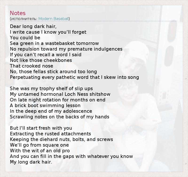 Уважаемый длинные темные волосы, Я пишу , потому что я знаю, что вы забудете о том, Вы могли бы быть Морской зеленый в мусорную корзину завтра Нет отталкивания к моим недоношенных индульгенций Если вы не можете вспомнить слово, которое я сказал Не нравятся эти скулы Это кривым носом Нет, эти ребята придерживаться вокруг слишком долго Увековечению каждый жалкий слово , что я в него асимметрию песни Она была моим трофеем полка скольжения UPS Моя дикая гормональный Лох- Несс shitshow На поздней ночи вращения в течение нескольких месяцев подряд Кирпич загрузки урок плавания В глубокий конец моей юности Каракули заметки на спинах моих руках Но я начну все заново с вами Извлечение ржавые вложения Ведение несгибаемых гайки, болты и винты Мы пойдем с нуля С ума старого профи И вы можете заполнить пробелы с тем, что вы знаете, Моя длинные темные волосы .