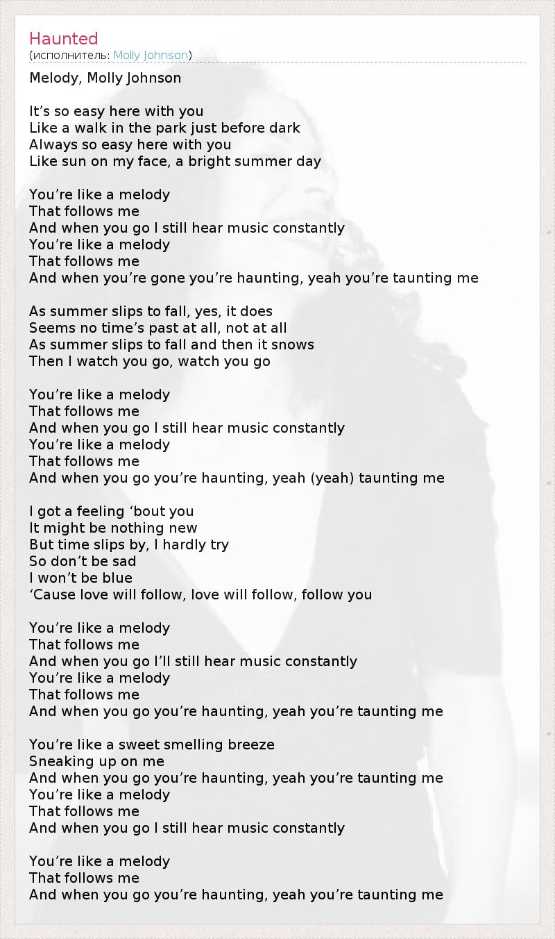 Melody, Molly Johnson It’s so easy here with you Like a walk in the park just before dark Always so easy here with you Like sun on my face, a bright summer day You’re like a melody That follows me And when you go I still hear music constantly You’re like a melody That follows me And when you’re gone you’re haunting, yeah you’re taunting me As summer slips to fall, yes, it does Seems no time’s past at all, not at all As summer slips to fall and then it snows Then I watch you go, watch you go You’re like a melody That follows me And when you go I still hear music constantly You’re like a melody That follows me And when you go you’re haunting, yeah (yeah) taunting me I got a feeling ‘bout you It might be nothing new But time slips by, I hardly try So don’t be sad I won’t be blue ‘Cause love will follow, love will follow, follow you You’re like a melody That follows me And when you go I’ll still hear music constantly You’re like a melody That follows me And when you go you’re haunting, yeah you’re taunting me You’re like a sweet smelling breeze Sneaking up on me And when you go you’re haunting, yeah you’re taunting me You’re like a melody That follows me And when you go I still hear music constantly You’re like a melody That follows me And when you go you’re haunting, yeah you’re taunting me