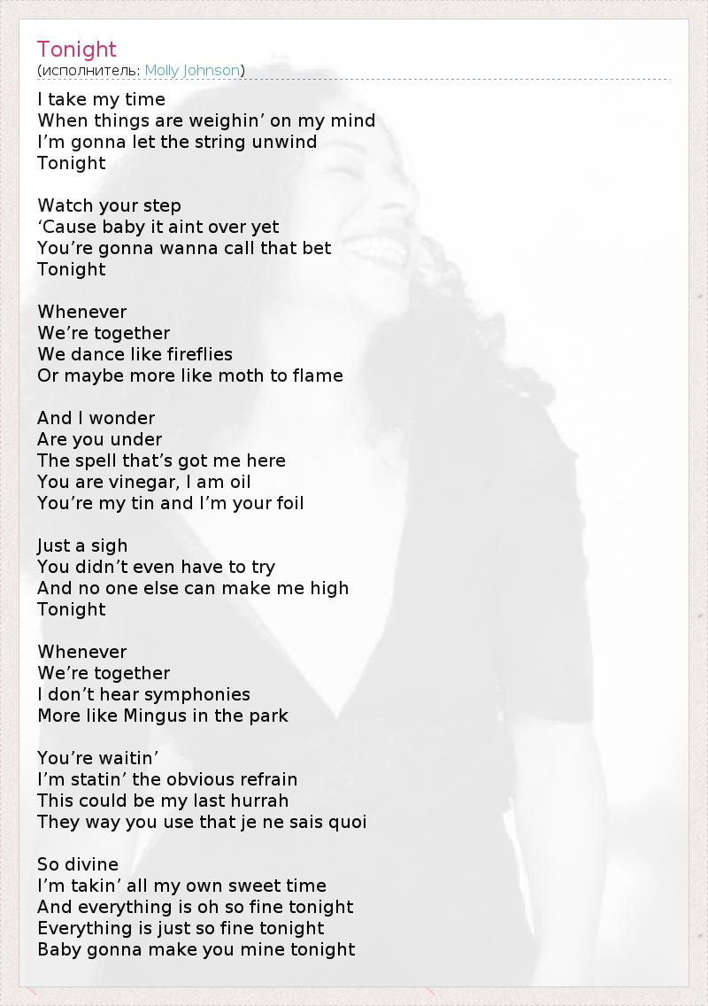 I take my time When things are weighin’ on my mind I’m gonna let the string unwind Tonight Watch your step ‘Cause baby it aint over yet You’re gonna wanna call that bet Tonight Whenever We’re together We dance like fireflies Or maybe more like moth to flame And I wonder Are you under The spell that’s got me here You are vinegar, I am oil You’re my tin and I’m your foil Just a sigh You didn’t even have to try And no one else can make me high Tonight Whenever We’re together I don’t hear symphonies More like Mingus in the park You’re waitin’ I’m statin’ the obvious refrain This could be my last hurrah They way you use that je ne sais quoi So divine I’m takin’ all my own sweet time And everything is oh so fine tonight Everything is just so fine tonight Baby gonna make you mine tonight