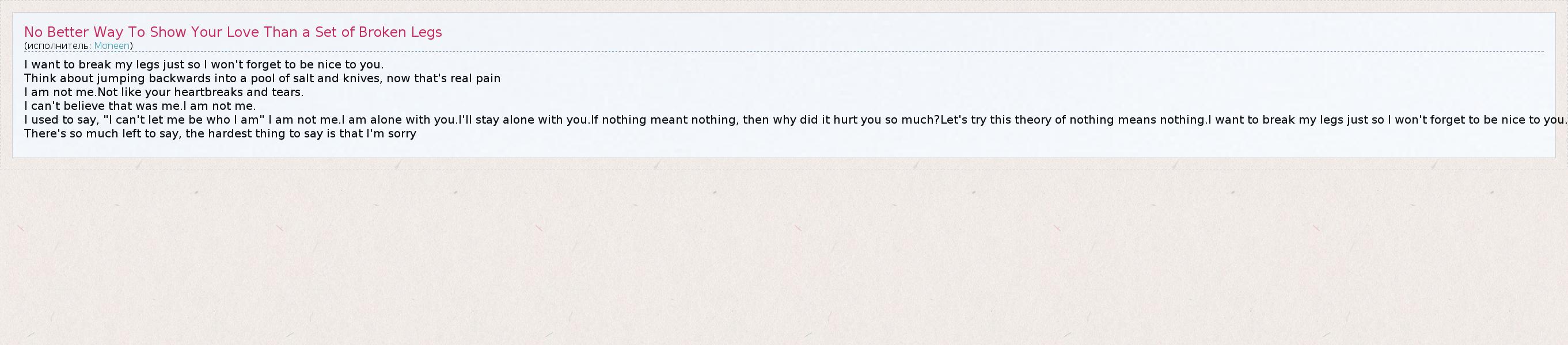 ГлавнаяИсполнителиMoneenNo Better Way To Show Your Love Than a Set of Broken Legs