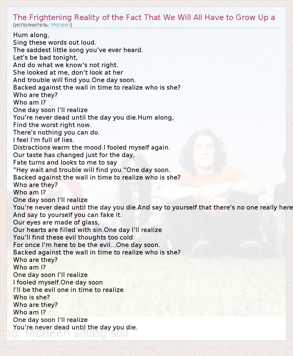 ГлавнаяИсполнителиMoneenThe Frightening Reality of the Fact That We Will All Have to Grow Up a