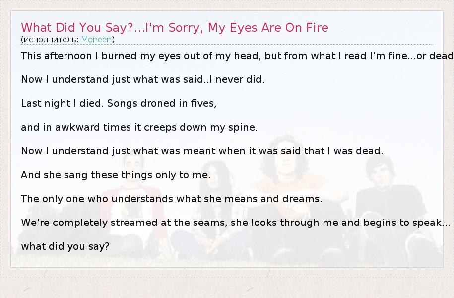 А как ты думаешь, о чем песня "What Did You Say?...I'm Sorry, My Eyes Are On Fire" ?