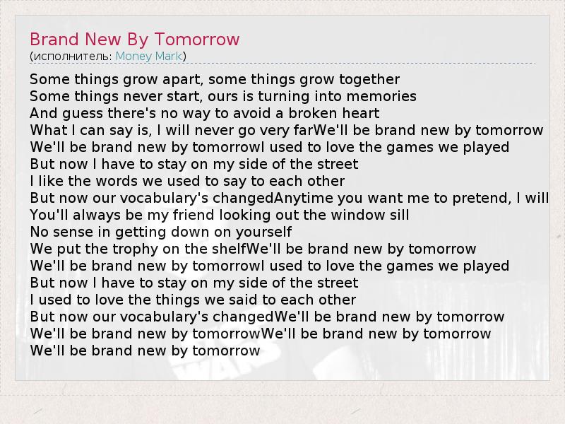 Some things grow apart, some things grow together Some things never start, ours is turning into memories And guess there's no way to avoid a broken heart What I can say is, I will never go very farWe'll be brand new by tomorrow We'll be brand new by tomorrowI used to love the games we played But now I have to stay on my side of the street I like the words we used to say to each other But now our vocabulary's changedAnytime you want me to pretend, I will You'll always be my friend looking out the window sill No sense in getting down on yourself We put the trophy on the shelfWe'll be brand new by tomorrow We'll be brand new by tomorrowI used to love the games we played But now I have to stay on my side of the street I used to love the things we said to each other But now our vocabulary's changedWe'll be brand new by tomorrow We'll be brand new by tomorrowWe'll be brand new by tomorrow We'll be brand new by tomorrow
