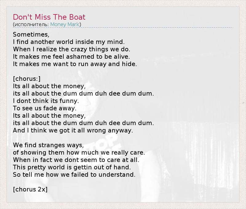 А как ты думаешь, о чем песня "Don't Miss The Boat" ?