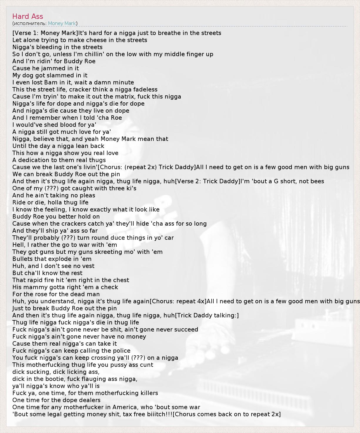 [Verse 1: Money Mark]It's hard for a nigga just to breathe in the streets Let alone trying to make cheese in the streets Nigga's bleeding in the streets So I don't go, unless I'm chillin' on the low with my middle finger up And I'm ridin' for Buddy Roe Cause he jammed in it My dog got slammed in it I even lost Bam in it, wait a damn minute This the street life, cracker think a nigga fadeless Cause I'm tryin' to make it out the matrix, fuck this nigga Nigga's life for dope and nigga's die for dope And nigga's die cause they live on dope And I remember when I told 'cha Roe I would've shed blood for ya' A nigga still got much love for ya' Nigga, believe that, and yeah Money Mark mean that Until the day a nigga lean back This how a nigga show you real love A dedication to them real thugs Cause we the last one's livin'[Chorus: (repeat 2x) Trick Daddy]All I need to get on is a few good men with big guns We can break Buddy Roe out the pin And then it's thug life again nigga, thug life nigga, huh[Verse 2: Trick Daddy]I'm 'bout a G short, not bees One of my (???) got caught with three ki's And he ain't taking no pleas Ride or die, holla thug life I know the feeling, I know exactly what it look like Buddy Roe you better hold on Cause when the crackers catch ya' they'll hide 'cha ass for so long And they'll ship ya' ass so far They'll probably (???) turn round duce things in yo' car Hell, I rather the go to war with 'em They got guns but my guns skreeting mo' with 'em Bullets that explode in 'em Huh, and I don't see no vest But cha'll know the rest That rapid fire hit 'em right in the chest His mammy gotta right 'em a check For the rose for the dead man Huh, you understand, nigga it's thug life again[Chorus: repeat 4x]All I need to get on is a few good men with big guns Just to break Buddy Roe out the pin And then it's thug life again nigga, thug life nigga, huh[Trick Daddy talking:] Thug life nigga fuck nigga's die in thug life Fuck nigga's ain't gone never be shit, ain't gone never succeed Fuck nigga's ain't gone never have no money Cause them real nigga's can take it Fuck nigga's can keep calling the police You fuck nigga's can keep crossing ya'll (???) on a nigga This motherfucking thug life you pussy ass cunt dick sucking, dick licking ass, dick in the bootie, fuck flauging ass nigga, ya'll nigga's know who ya'll is Fuck ya, one time, for them motherfucking killers One time for the dope dealers One time for any motherfucker in America, who 'bout some war 'Bout some legal getting money shit, tax free biiitch!!![Chorus comes back on to repeat 2x]