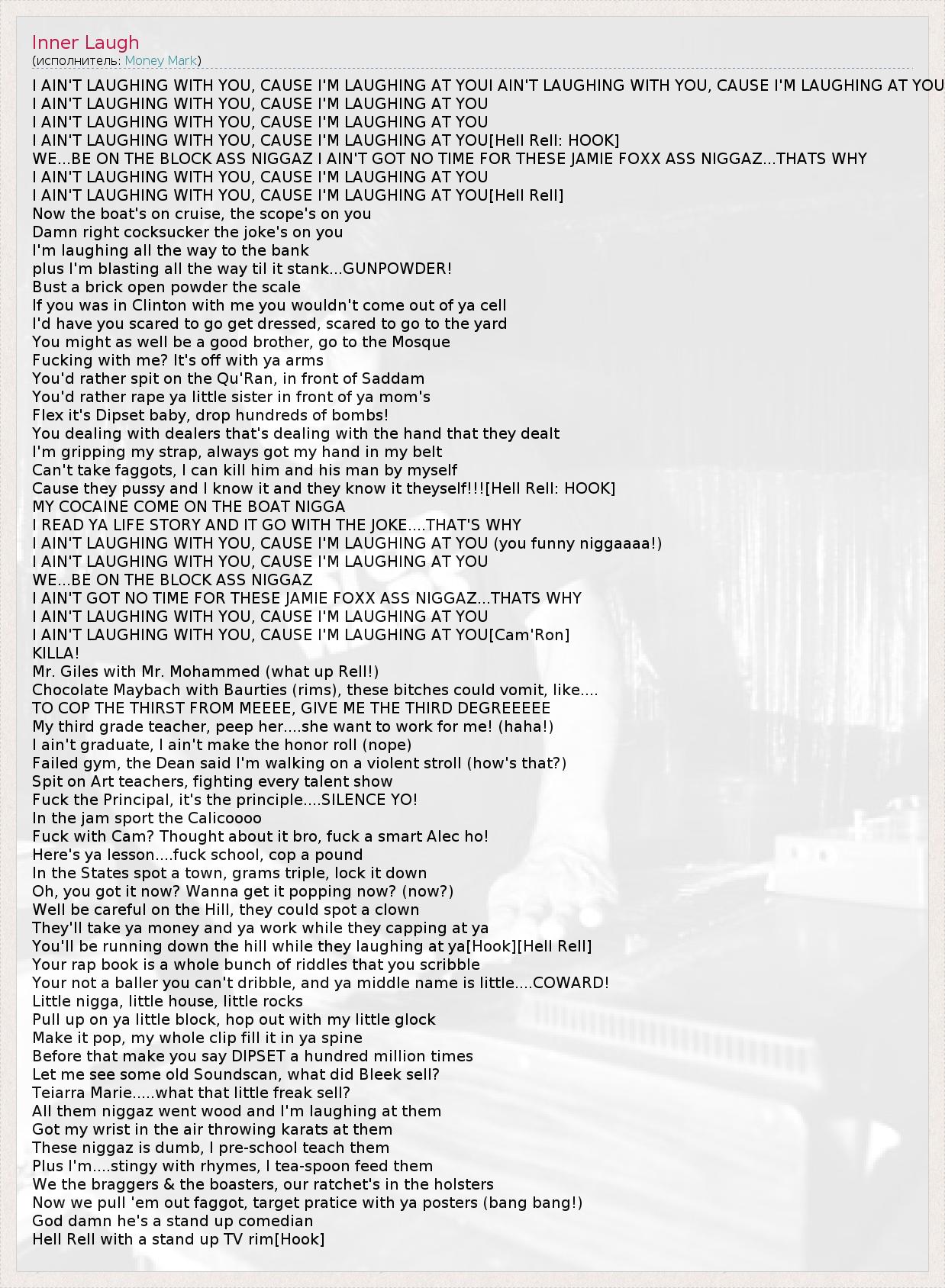 I AIN'T LAUGHING WITH YOU, CAUSE I'M LAUGHING AT YOUI AIN'T LAUGHING WITH YOU, CAUSE I'M LAUGHING AT YOU I AIN'T LAUGHING WITH YOU, CAUSE I'M LAUGHING AT YOU I AIN'T LAUGHING WITH YOU, CAUSE I'M LAUGHING AT YOU I AIN'T LAUGHING WITH YOU, CAUSE I'M LAUGHING AT YOU[Hell Rell: HOOK] WE...BE ON THE BLOCK ASS NIGGAZ I AIN'T GOT NO TIME FOR THESE JAMIE FOXX ASS NIGGAZ...THATS WHY I AIN'T LAUGHING WITH YOU, CAUSE I'M LAUGHING AT YOU I AIN'T LAUGHING WITH YOU, CAUSE I'M LAUGHING AT YOU[Hell Rell] Now the boat's on cruise, the scope's on you Damn right cocksucker the joke's on you I'm laughing all the way to the bank plus I'm blasting all the way til it stank...GUNPOWDER! Bust a brick open powder the scale If you was in Clinton with me you wouldn't come out of ya cell I'd have you scared to go get dressed, scared to go to the yard You might as well be a good brother, go to the Mosque Fucking with me? It's off with ya arms You'd rather spit on the Qu'Ran, in front of Saddam You'd rather rape ya little sister in front of ya mom's Flex it's Dipset baby, drop hundreds of bombs! You dealing with dealers that's dealing with the hand that they dealt I'm gripping my strap, always got my hand in my belt Can't take faggots, I can kill him and his man by myself Cause they pussy and I know it and they know it theyself!!![Hell Rell: HOOK] MY COCAINE COME ON THE BOAT NIGGA I READ YA LIFE STORY AND IT GO WITH THE JOKE....THAT'S WHY I AIN'T LAUGHING WITH YOU, CAUSE I'M LAUGHING AT YOU (you funny niggaaaa!) I AIN'T LAUGHING WITH YOU, CAUSE I'M LAUGHING AT YOU WE...BE ON THE BLOCK ASS NIGGAZ I AIN'T GOT NO TIME FOR THESE JAMIE FOXX ASS NIGGAZ...THATS WHY I AIN'T LAUGHING WITH YOU, CAUSE I'M LAUGHING AT YOU I AIN'T LAUGHING WITH YOU, CAUSE I'M LAUGHING AT YOU[Cam'Ron] KILLA! Mr. Giles with Mr. Mohammed (what up Rell!) Chocolate Maybach with Baurties (rims), these bitches could vomit, like.... TO COP THE THIRST FROM MEEEE, GIVE ME THE THIRD DEGREEEEE My third grade teacher, peep her....she want to work for me! (haha!) I ain't graduate, I ain't make the honor roll (nope) Failed gym, the Dean said I'm walking on a violent stroll (how's that?) Spit on Art teachers, fighting every talent show Fuck the Principal, it's the principle....SILENCE YO! In the jam sport the Calicoooo Fuck with Cam? Thought about it bro, fuck a smart Alec ho! Here's ya lesson....fuck school, cop a pound In the States spot a town, grams triple, lock it down Oh, you got it now? Wanna get it popping now? (now?) Well be careful on the Hill, they could spot a clown They'll take ya money and ya work while they capping at ya You'll be running down the hill while they laughing at ya[Hook][Hell Rell] Your rap book is a whole bunch of riddles that you scribble Your not a baller you can't dribble, and ya middle name is little....COWARD! Little nigga, little house, little rocks Pull up on ya little block, hop out with my little glock Make it pop, my whole clip fill it in ya spine Before that make you say DIPSET a hundred million times Let me see some old Soundscan, what did Bleek sell? Teiarra Marie.....what that little freak sell? All them niggaz went wood and I'm laughing at them Got my wrist in the air throwing karats at them These niggaz is dumb, I pre-school teach them Plus I'm....stingy with rhymes, I tea-spoon feed them We the braggers & the boasters, our ratchet's in the holsters Now we pull 'em out faggot, target pratice with ya posters (bang bang!) God damn he's a stand up comedian Hell Rell with a stand up TV rim[Hook]