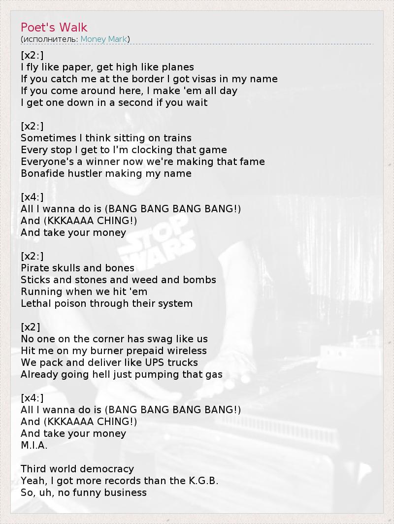 [x2:] I fly like paper, get high like planes If you catch me at the border I got visas in my name If you come around here, I make 'em all day I get one down in a second if you wait [x2:] Sometimes I think sitting on trains Every stop I get to I'm clocking that game Everyone's a winner now we're making that fame Bonafide hustler making my name [x4:] All I wanna do is (BANG BANG BANG BANG!) And (KKKAAAA CHING!) And take your money [x2:] Pirate skulls and bones Sticks and stones and weed and bombs Running when we hit 'em Lethal poison through their system [x2] No one on the corner has swag like us Hit me on my burner prepaid wireless We pack and deliver like UPS trucks Already going hell just pumping that gas [x4:] All I wanna do is (BANG BANG BANG BANG!) And (KKKAAAA CHING!) And take your money M.I.A. Third world democracy Yeah, I got more records than the K.G.B. So, uh, no funny business