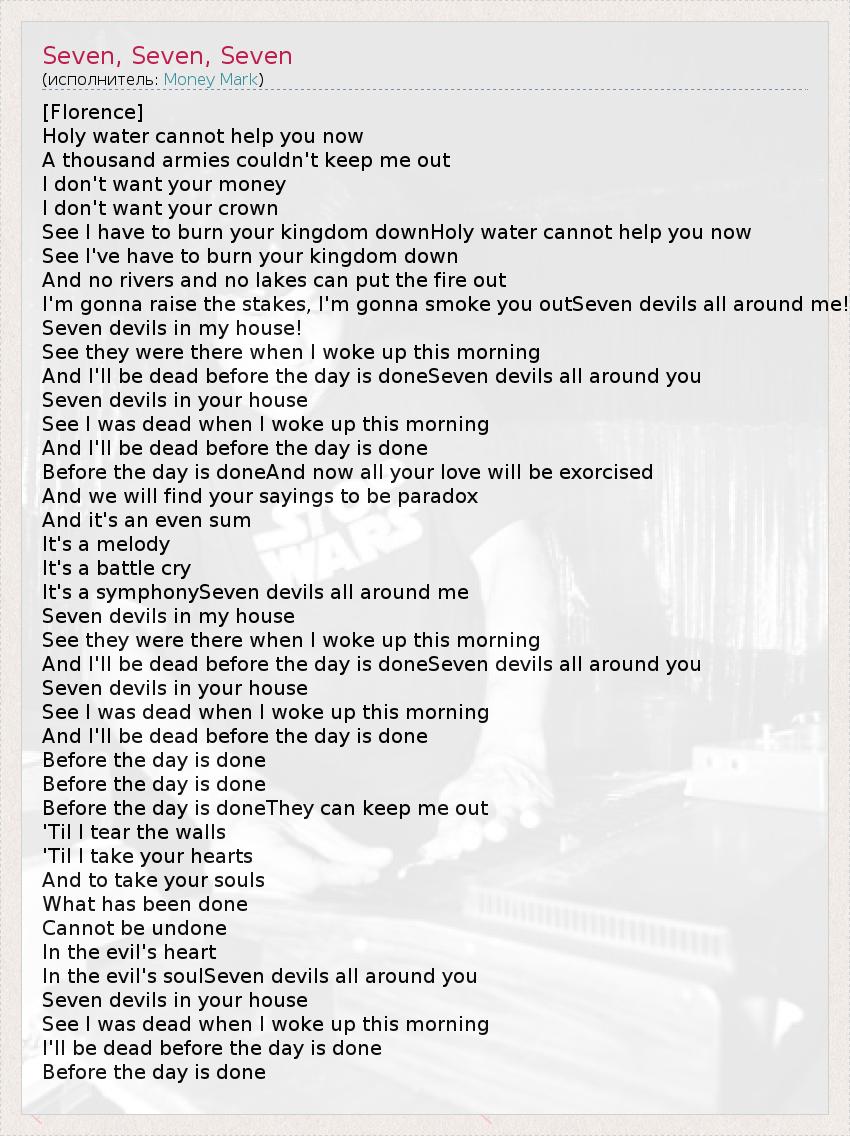 [Florence] Holy water cannot help you now A thousand armies couldn't keep me out I don't want your money I don't want your crown See I have to burn your kingdom downHoly water cannot help you now See I've have to burn your kingdom down And no rivers and no lakes can put the fire out I'm gonna raise the stakes, I'm gonna smoke you outSeven devils all around me! Seven devils in my house! See they were there when I woke up this morning And I'll be dead before the day is doneSeven devils all around you Seven devils in your house See I was dead when I woke up this morning And I'll be dead before the day is done Before the day is doneAnd now all your love will be exorcised And we will find your sayings to be paradox And it's an even sum It's a melody It's a battle cry It's a symphonySeven devils all around me Seven devils in my house See they were there when I woke up this morning And I'll be dead before the day is doneSeven devils all around you Seven devils in your house See I was dead when I woke up this morning And I'll be dead before the day is done Before the day is done Before the day is done Before the day is doneThey can keep me out 'Til I tear the walls 'Til I take your hearts And to take your souls What has been done Cannot be undone In the evil's heart In the evil's soulSeven devils all around you Seven devils in your house See I was dead when I woke up this morning I'll be dead before the day is done Before the day is done