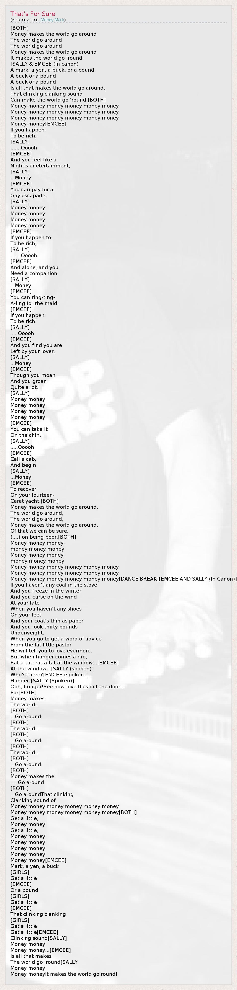 [BOTH] Money makes the world go around The world go around The world go around Money makes the world go around It makes the world go 'round. [SALLY & EMCEE (In canon) A mark, a yen, a buck, or a pound A buck or a pound A buck or a pound Is all that makes the world go around, That clinking clanking sound Can make the world go 'round.[BOTH] Money money money money money money Money money money money money money Money money money money money money Money money[EMCEE] If you happen To be rich, [SALLY] .......Ooooh [EMCEE] And you feel like a Night's enetertainment, [SALLY] ...Money [EMCEE] You can pay for a Gay escapade. [SALLY] Money money Money money Money money Money money [EMCEE] If you happen to To be rich, [SALLY] .......Ooooh [EMCEE] And alone, and you Need a companion [SALLY] ...Money [EMCEE] You can ring-ting- A-ling for the maid. [EMCEE] If you happen To be rich [SALLY] .....Ooooh [EMCEE] And you find you are Left by your lover, [SALLY] ...Money [EMCEE] Though you moan And you groan Quite a lot, [SALLY] Money money Money money Money money Money money [EMCEE] You can take it On the chin, [SALLY] .....Ooooh [EMCEE] Call a cab, And begin [SALLY] ...Money [EMCEE] To recover On your fourteen- Carat yacht.[BOTH] Money makes the world go around, The world go around, The world go around, Money makes the world go around, Of that we can be sure. (....) on being poor.[BOTH] Money money money- money money money Money money money- money money money Money money money money money money Money money money money money money Money money money money money money[DANCE BREAK][EMCEE AND SALLY (In Canon)] If you haven't any coal in the stove And you freeze in the winter And you curse on the wind At your fate When you haven't any shoes On your feet And your coat's thin as paper And you look thirty pounds Underweight. When you go to get a word of advice From the fat little pastor He will tell you to love evermore. But when hunger comes a rap, Rat-a-tat, rat-a-tat at the window...[EMCEE] At the window...[SALLY (spoken)] Who's there?[EMCEE (spoken)] Hunger![SALLY (Spoken)] Ooh, hunger!See how love flies out the door... For[BOTH] Money makes The world... [BOTH] ...Go around [BOTH] The world... [BOTH] ...Go around [BOTH] The world... [BOTH] ...Go around [BOTH] Money makes the .... Go around [BOTH] ...Go aroundThat clinking Clanking sound of Money money money money money money Money money money money money money[BOTH] Get a little, Money money Get a little, Money money Money money Money money Money money Money money[EMCEE] Mark, a yen, a buck [GIRLS] Get a little [EMCEE] Or a pound [GIRLS] Get a little [EMCEE] That clinking clanking [GIRLS] Get a little Get a little[EMCEE] Clinking sound[SALLY] Money money Money money...[EMCEE] Is all that makes The world go 'round[SALLY Money money Money moneyIt makes the world go round!