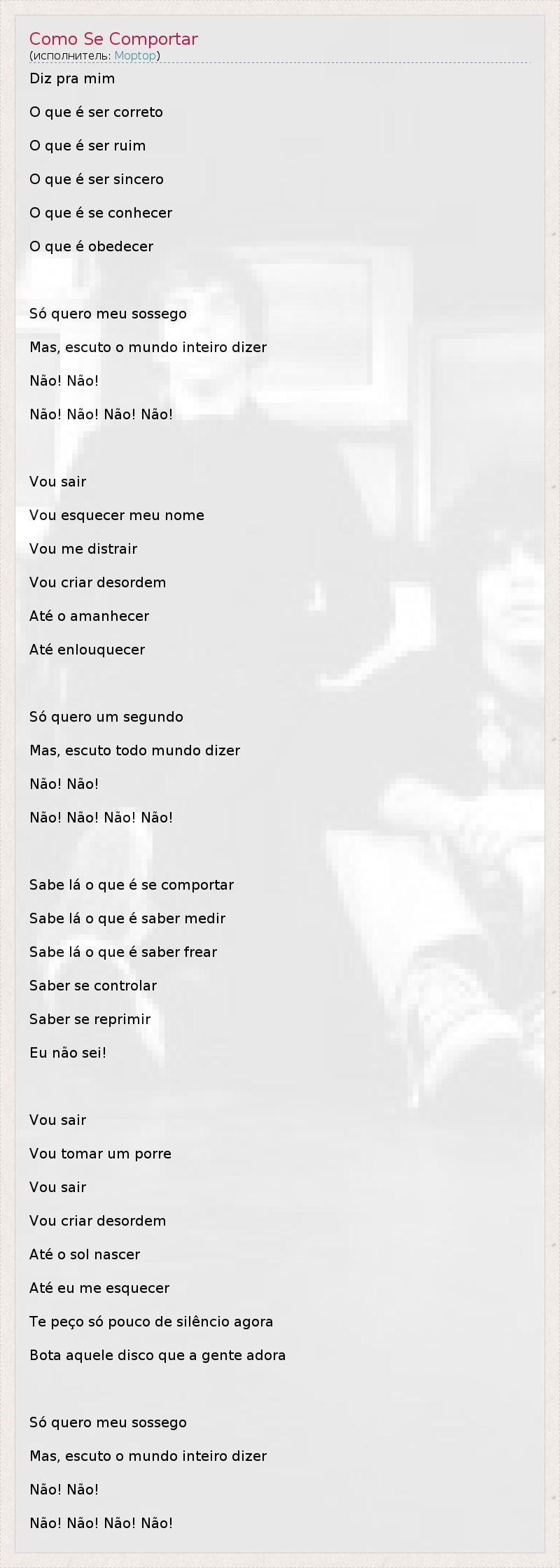 Diz pra mim O que é ser correto O que é ser ruim O que é ser sincero O que é se conhecer O que é obedecer Só quero meu sossego Mas, escuto o mundo inteiro dizer Não! Não! Não! Não! Não! Não! Vou sair Vou esquecer meu nome Vou me distrair Vou criar desordem Até o amanhecer Até enlouquecer Só quero um segundo Mas, escuto todo mundo dizer Não! Não! Não! Não! Não! Não! Sabe lá o que é se comportar Sabe lá o que é saber medir Sabe lá o que é saber frear Saber se controlar Saber se reprimir Eu não sei! Vou sair Vou tomar um porre Vou sair Vou criar desordem Até o sol nascer Até eu me esquecer Te peço só pouco de silêncio agora Bota aquele disco que a gente adora Só quero meu sossego Mas, escuto o mundo inteiro dizer Não! Não! Não! Não! Não! Não!