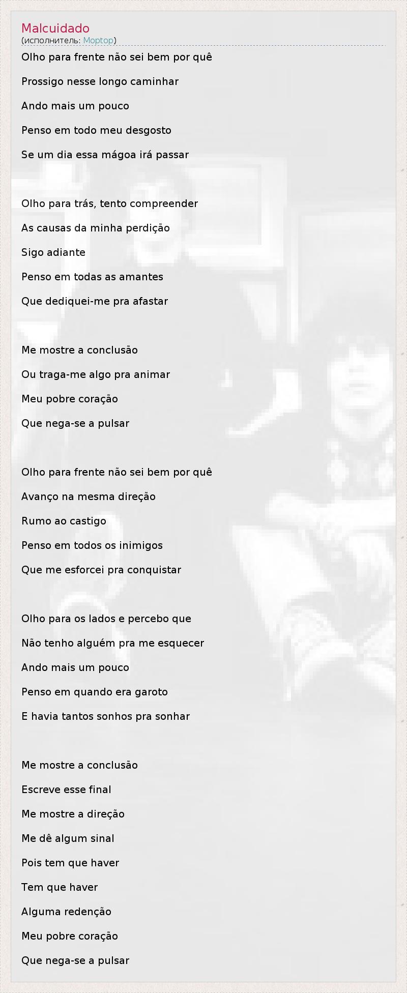 Olho para frente não sei bem por quê Prossigo nesse longo caminhar Ando mais um pouco Penso em todo meu desgosto Se um dia essa mágoa irá passar Olho para trás, tento compreender As causas da minha perdição Sigo adiante Penso em todas as amantes Que dediquei-me pra afastar Me mostre a conclusão Ou traga-me algo pra animar Meu pobre coração Que nega-se a pulsar Olho para frente não sei bem por quê Avanço na mesma direção Rumo ao castigo Penso em todos os inimigos Que me esforcei pra conquistar Olho para os lados e percebo que Não tenho alguém pra me esquecer Ando mais um pouco Penso em quando era garoto E havia tantos sonhos pra sonhar Me mostre a conclusão Escreve esse final Me mostre a direção Me dê algum sinal Pois tem que haver Tem que haver Alguma redenção Meu pobre coração Que nega-se a pulsar